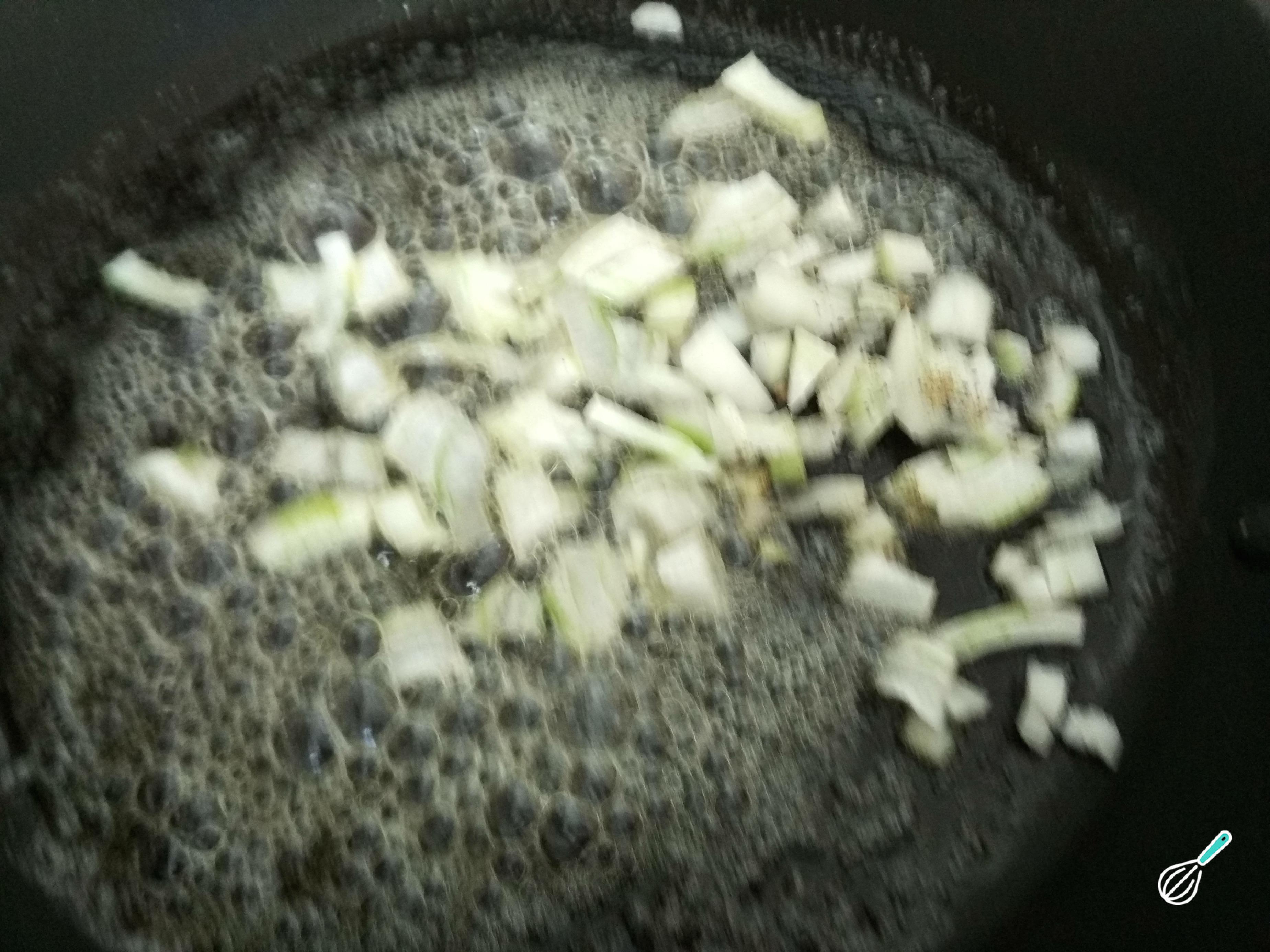 Em uma frigideira, derreta a manteiga e adicione a cebola picada finamente. Deixe cozinhar até ficar transparente.