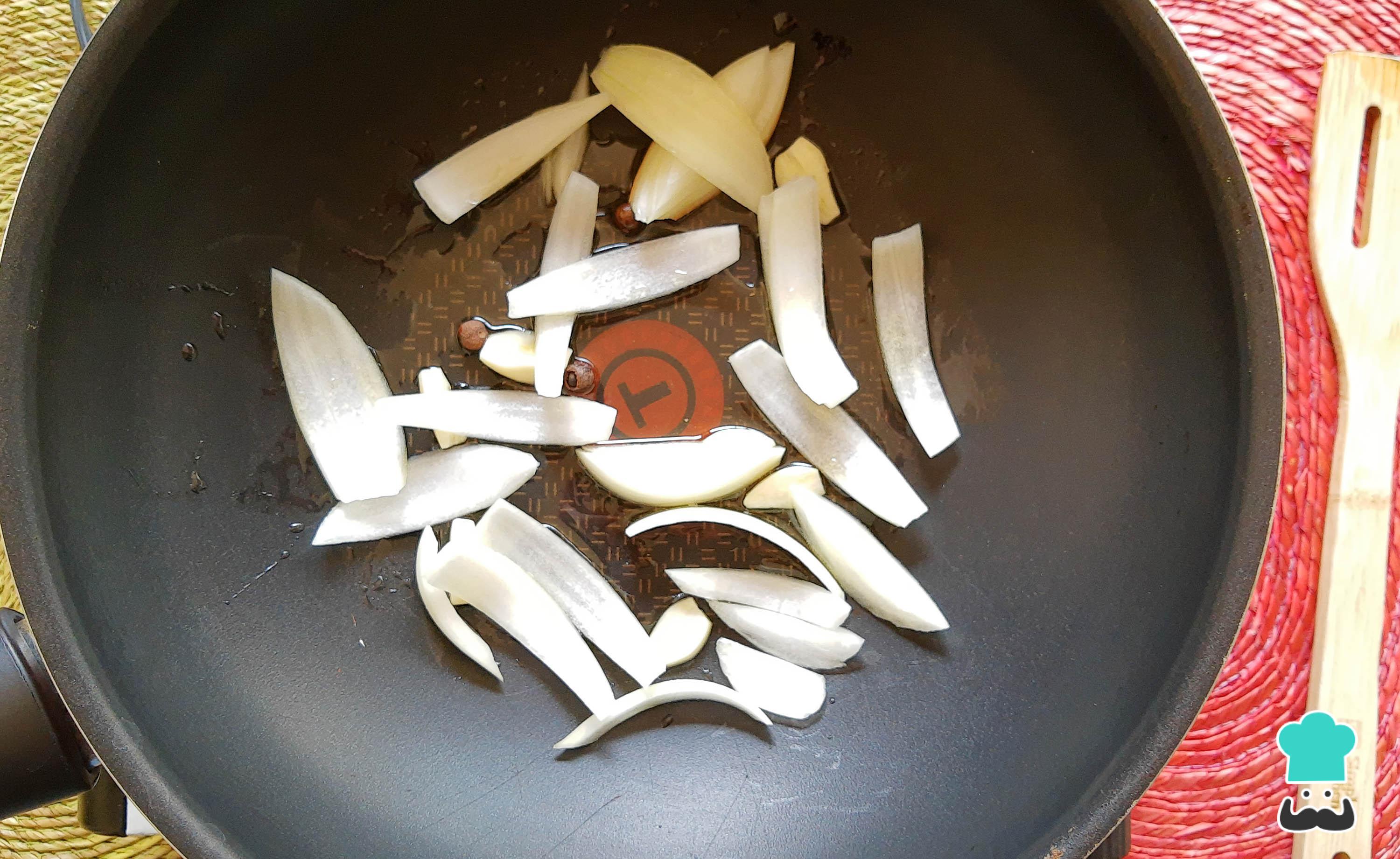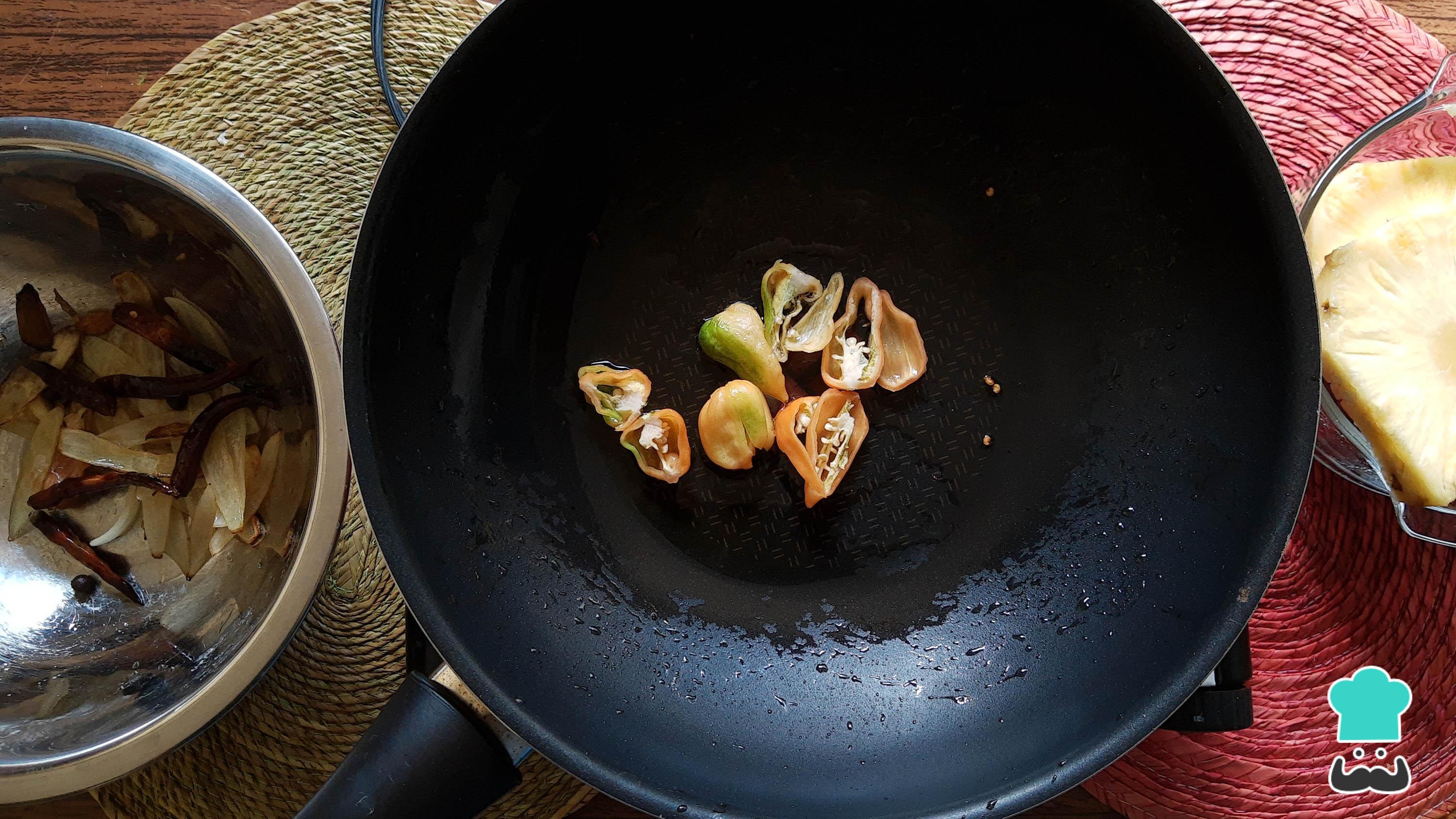 Fatie as pimentas habanero e frite por alguns minutos na mesma frigideira até dourar. Depois retire e reserve junto dos demais ingredientes.