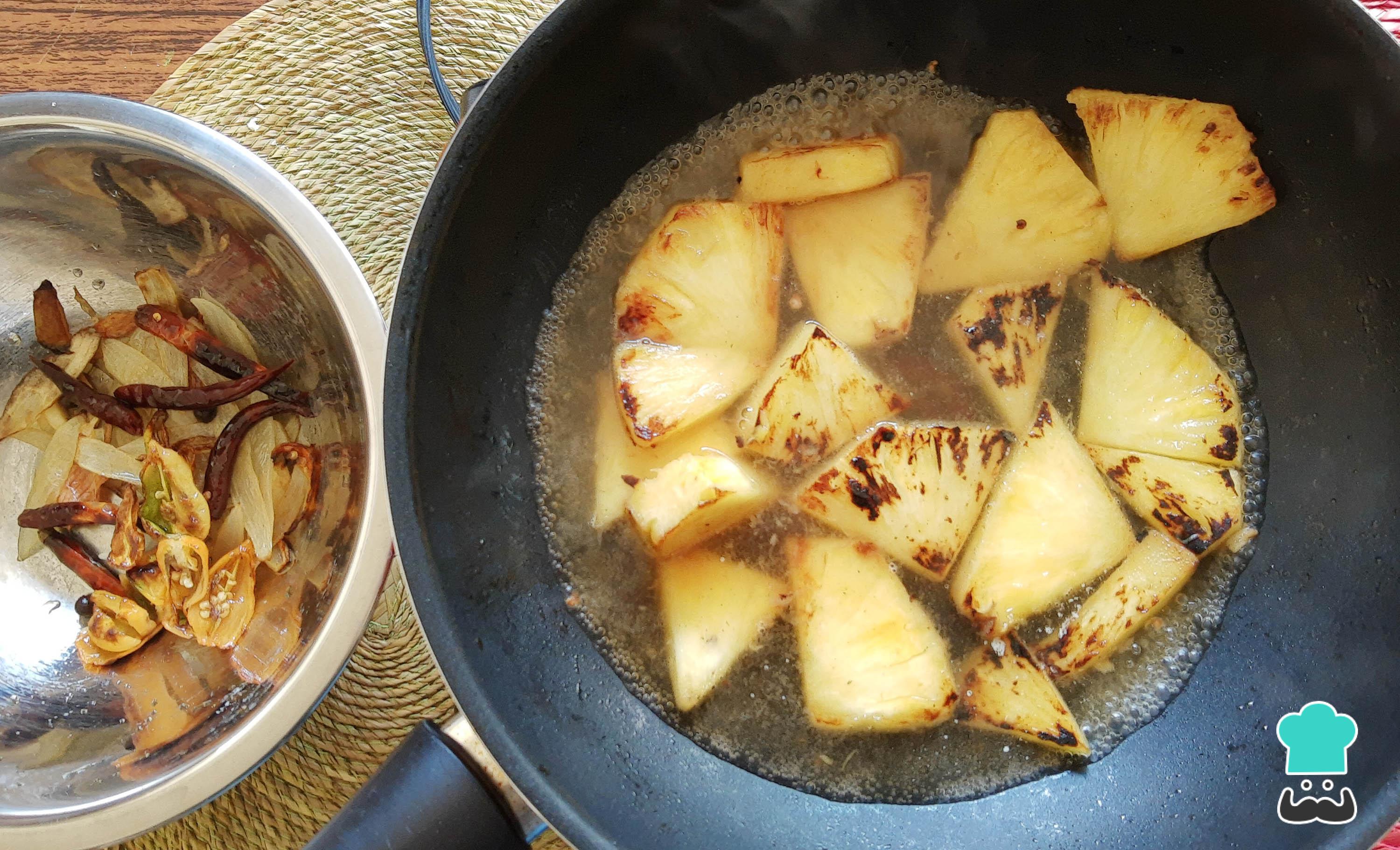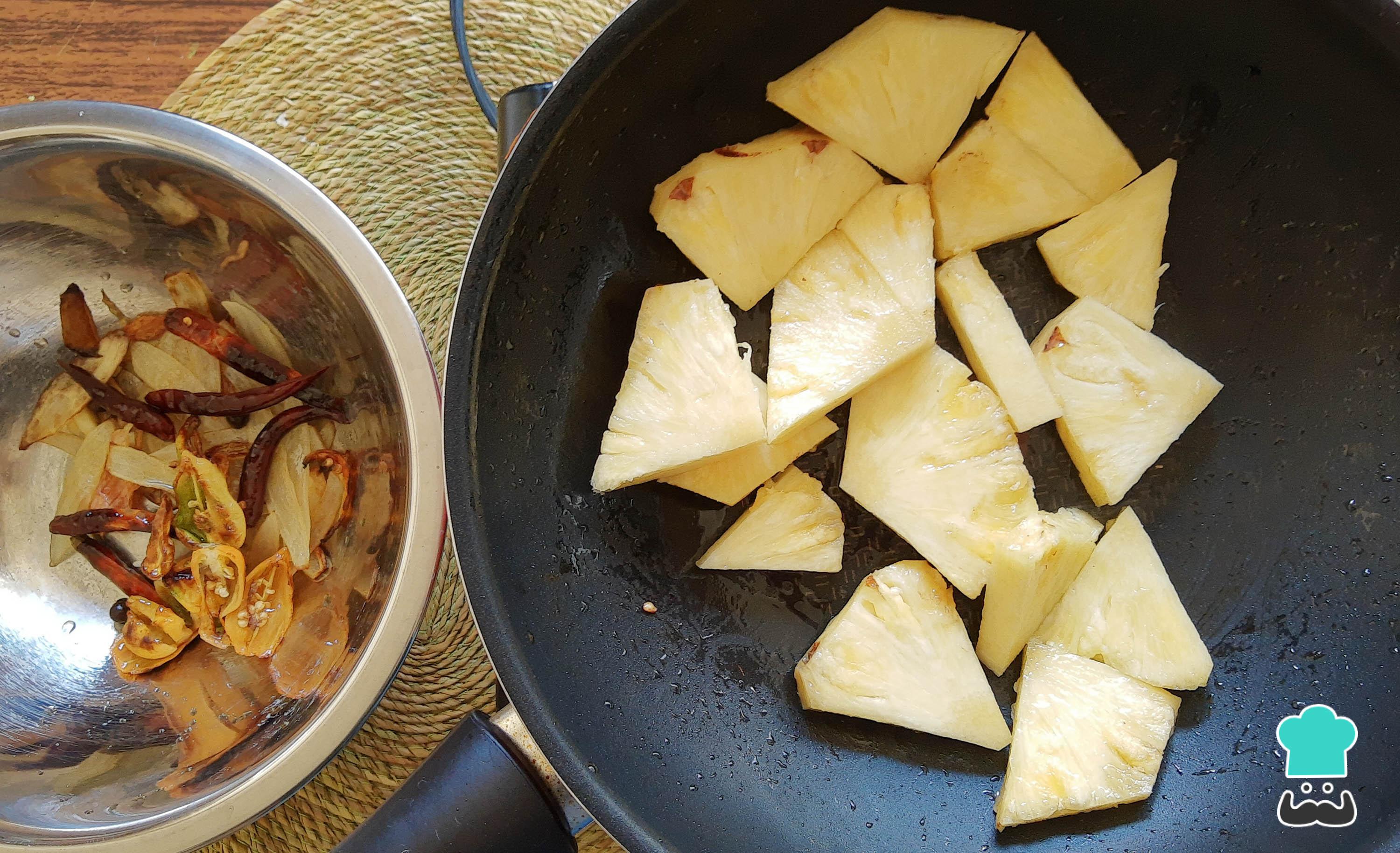 Por fim, na mesma frigideira, salteie o abacaxi cortado em pedaços até ficar douradinho.