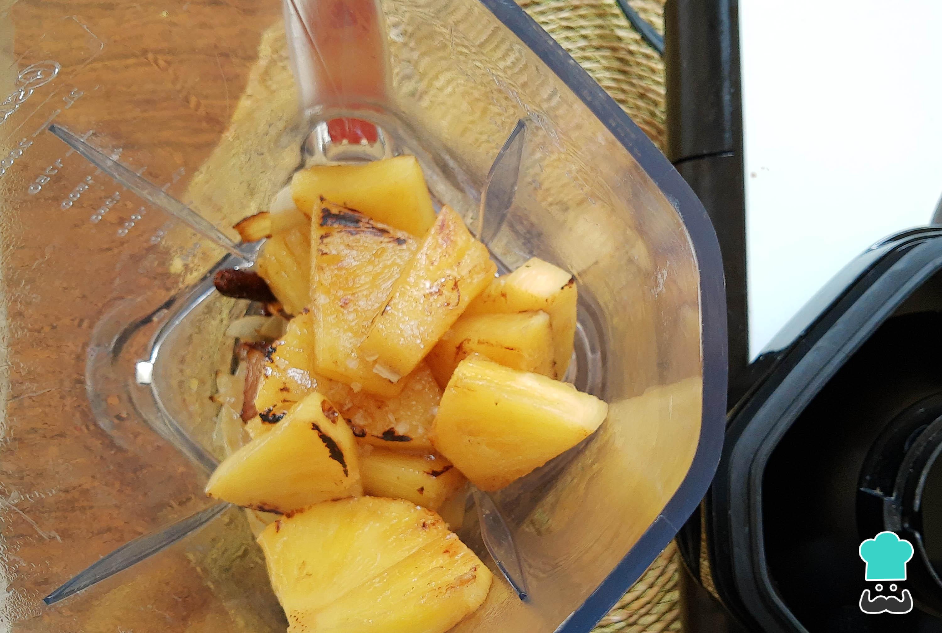 Finalmente, bata todos os ingredientes no liquidificador ou num processador: a cebola, os alhos, as pimentas, o abacaxi com o líquido da frigideira, o vinagre, o açúcar e sal a gosto. Será necessário bater por 2-3 minutos de modo a obter um molho o mais lisinho possível.