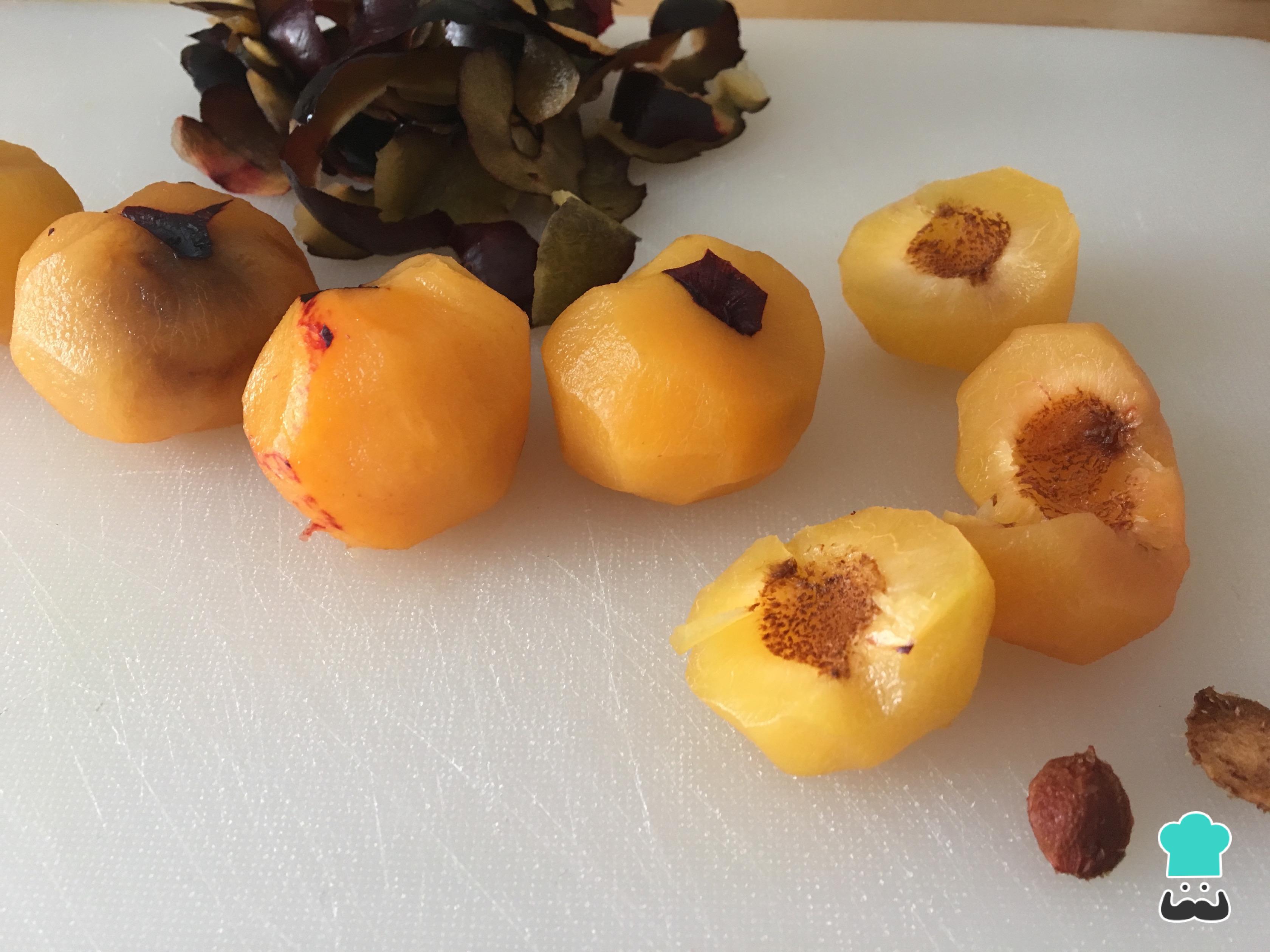 Lave as ameixas e descasque. Depois abra ao meio e retire o caroço.