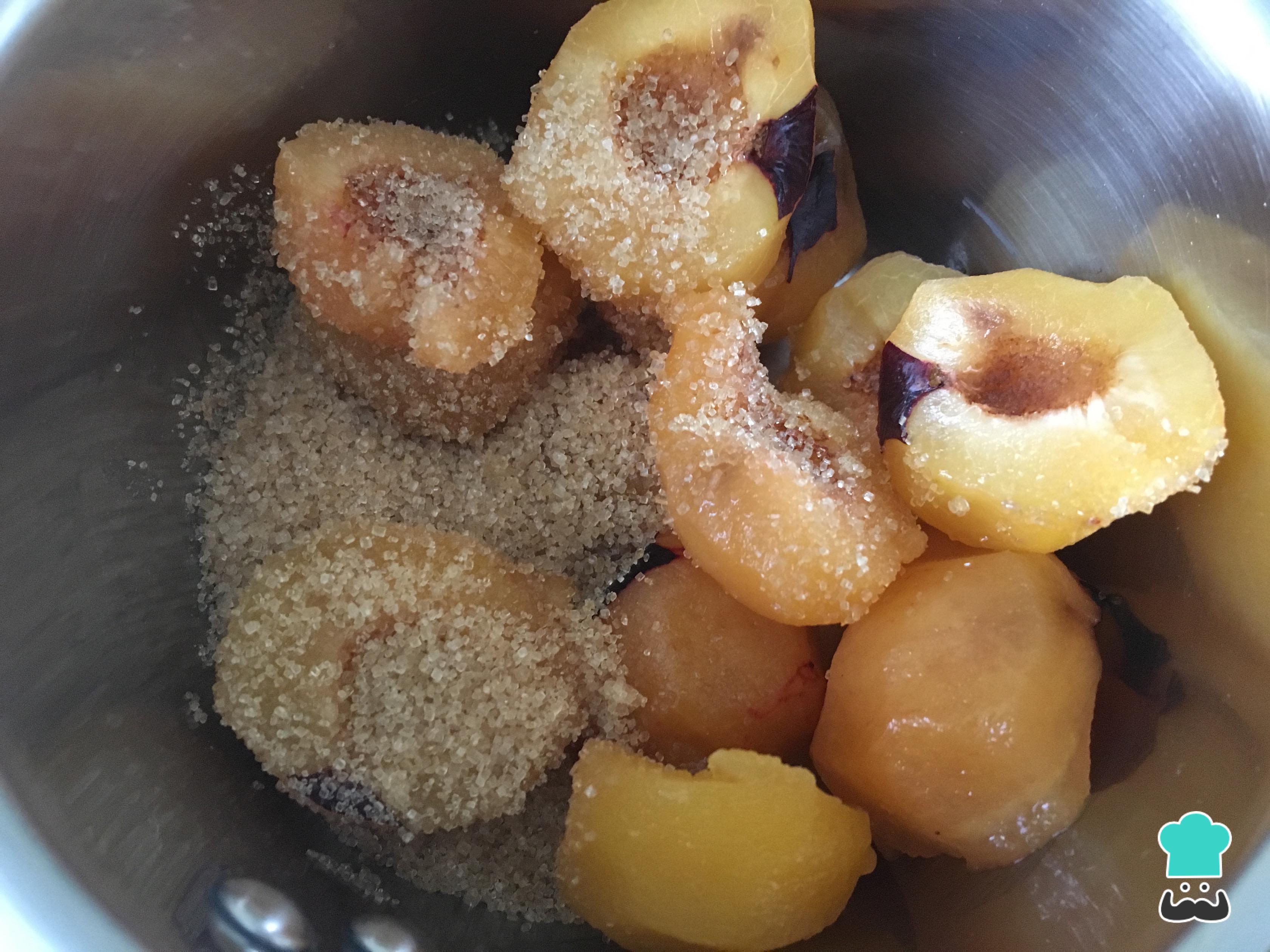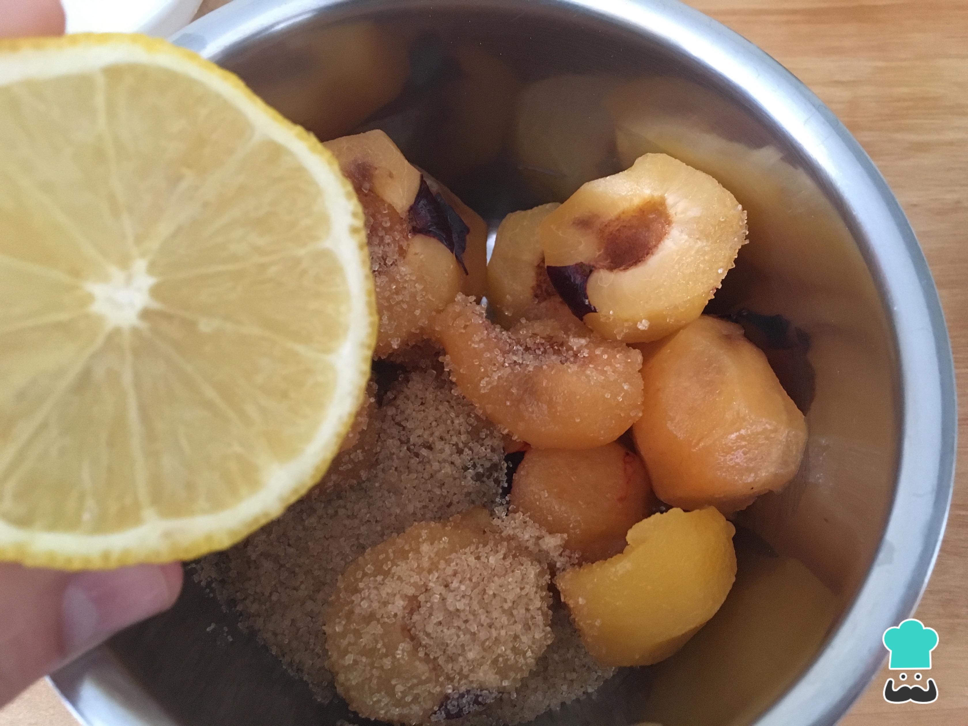 Coloque as ameixas numa panela e polvilhe o açúcar sobre elas. Deixe macerar por 15 minutos - durante esse tempo as ameixas irão absorver o açúcar e começar a libertar o seu suco.