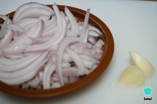 Descasque os alhos e a cebola e corte a cebola em lâminas, para que cozinhe mais depressa.
