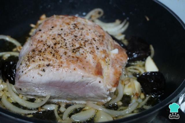 - Retire o lombo e, na mesma panela, refogue a cebola, os alhos e as ameixas por 2-3 minutos;