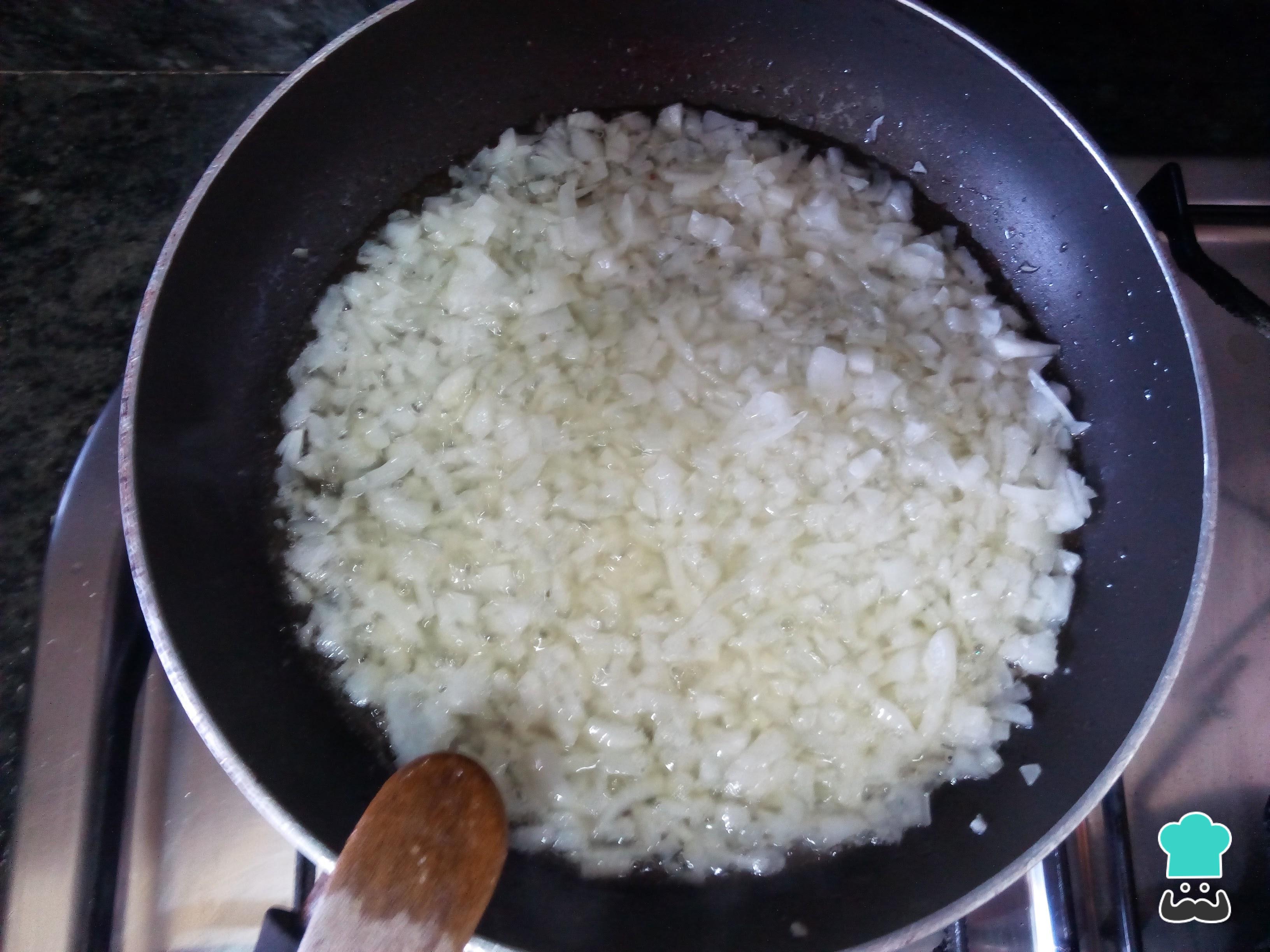 No dia seguinte finamente pique a cebola e leve ao fogo uma panela com óleo. Refogue a cebola até que fique transparente e, neste momento, se quiser também pode incluir cogumelos picados.