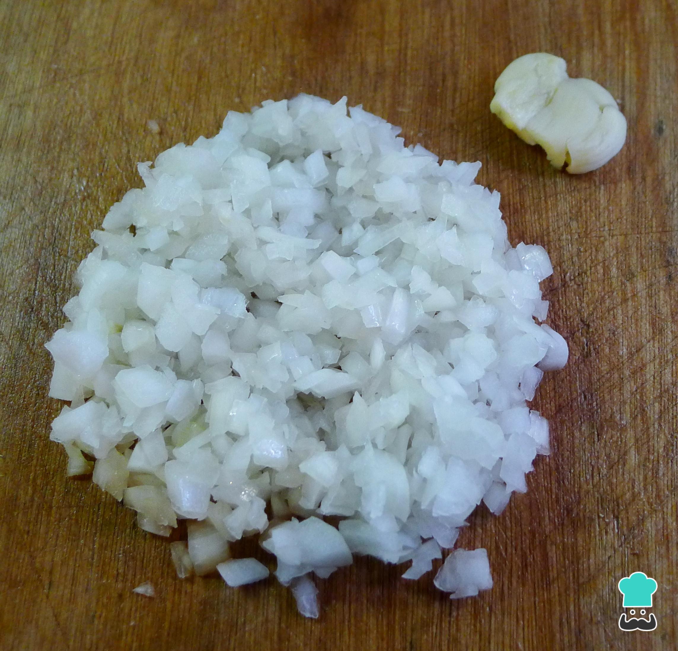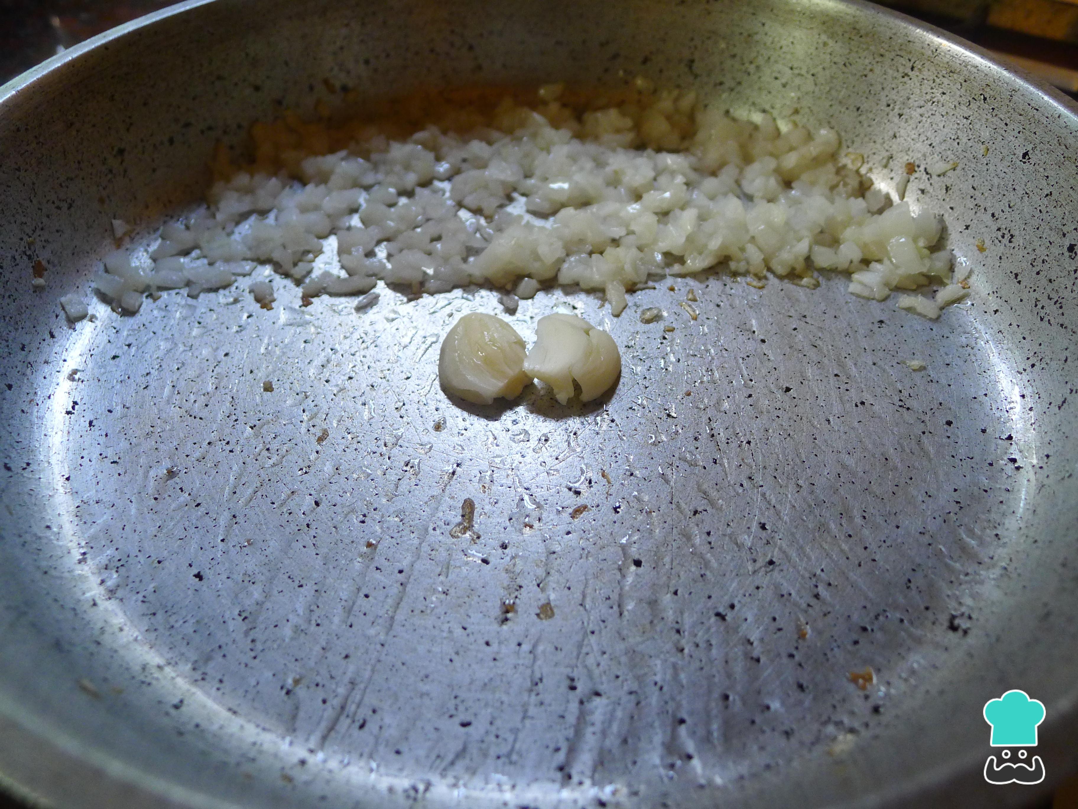 Coloque um pouco de azeite em uma panela e leve ao fogo. Primeiro refogue a cebola, até ficar transparente, e em seguida adicione o alho.
