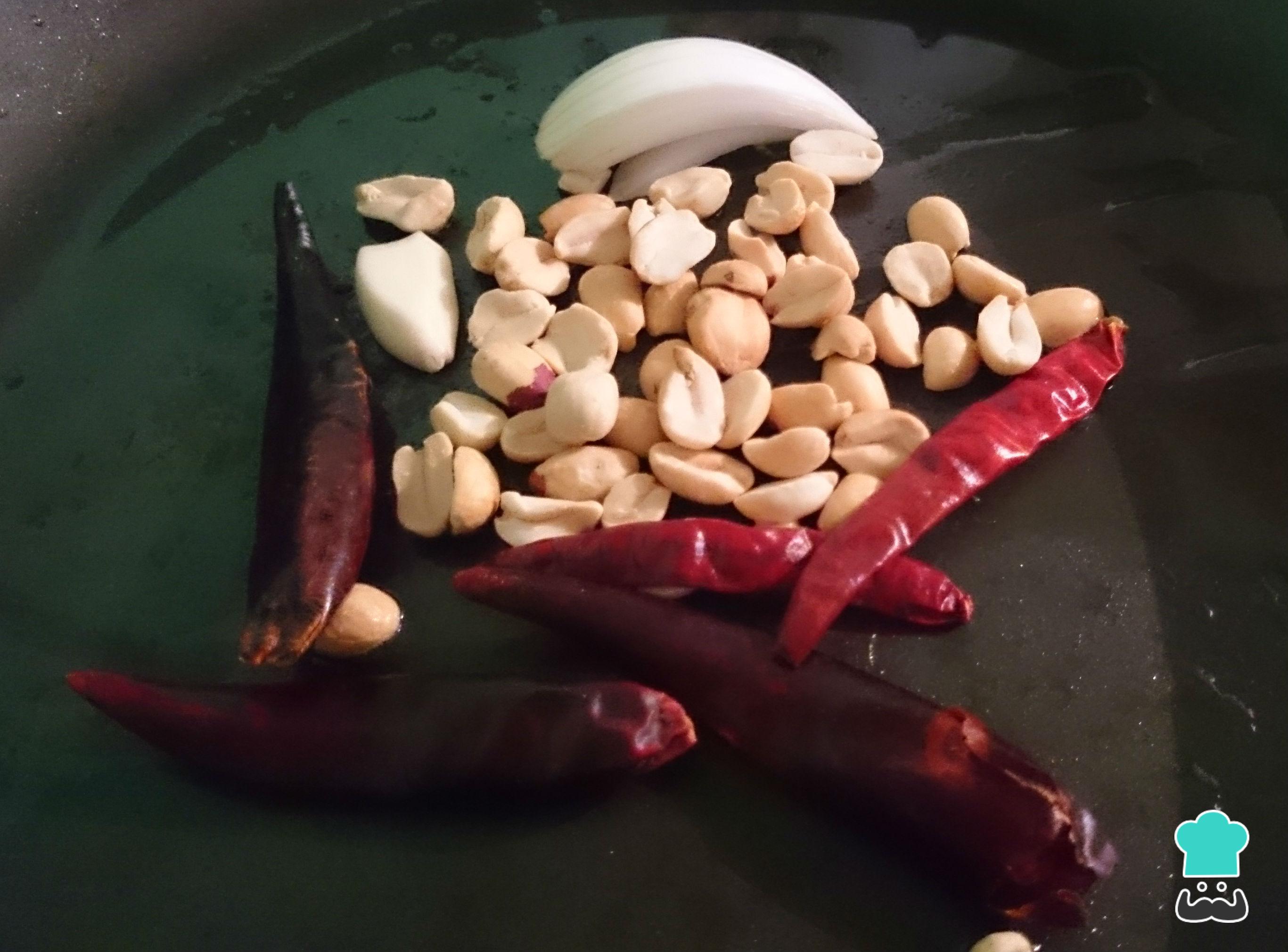 Em uma panela em fogo baixo coloque o óleo, o amendoim, as pimentas, a cebola e o dente de alho. Deixe cozinhar até que fiquem ligeiramente dourados e retire do fogo quando o óleo estiver um pouco vermelho, devido às pimentas.