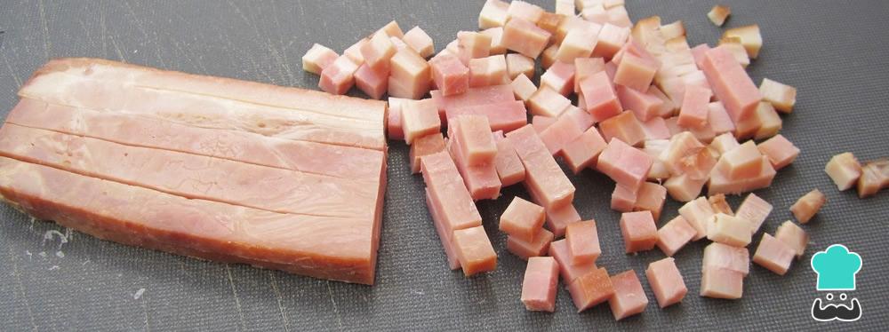 Para esta receita de molho de bacon o bacon teve ser cortado em cubos, tal como na fotografia, junto com a gordura.