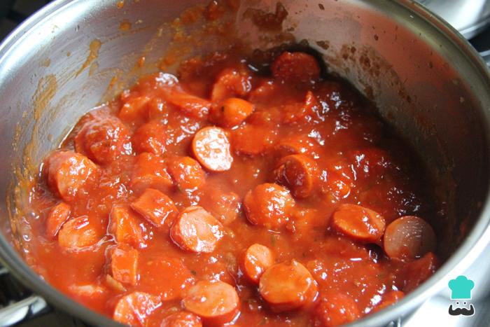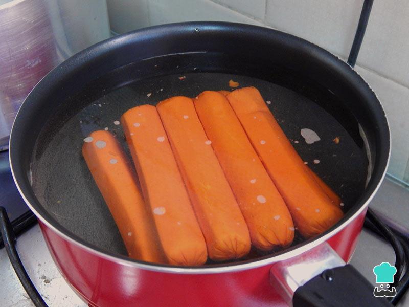 Para preparar o molho de cachorro quente comece por ferver as salsichas por 15 minutos em água. Desta forma você estará tirando o excesso de corante e conservantes. Escorra e corte em rodelas
