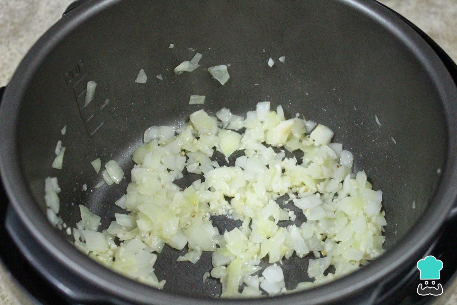 Numa panela em fogo médio doure a cebola picada, mexendo de vez em quando. Acrescente o alho e deixe fritar um pouquinho.