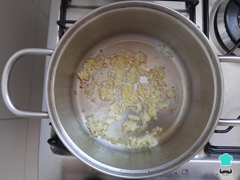 Numa panela média aqueça o azeite de oliva e refogue a cebola ralada rapidamente, até começar a dourar.