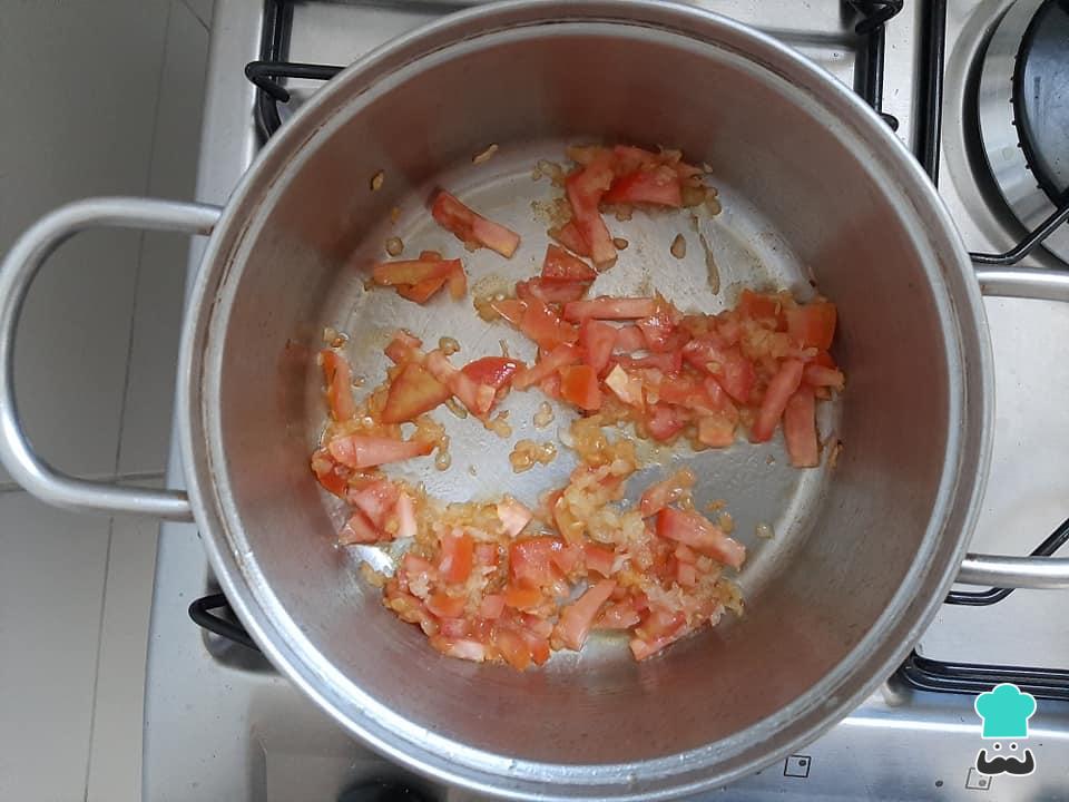Adicione o tomate picado, misture e refogue mais um pouco.