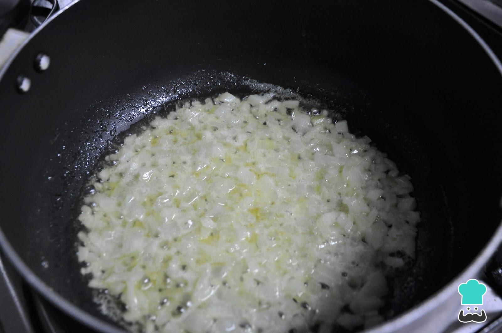 Preparar molho de Catupiry é bem simples! Comece por triturar ou picar finamente a cebola e os alhos e refogar numa panela em fogo médio com o azeite.