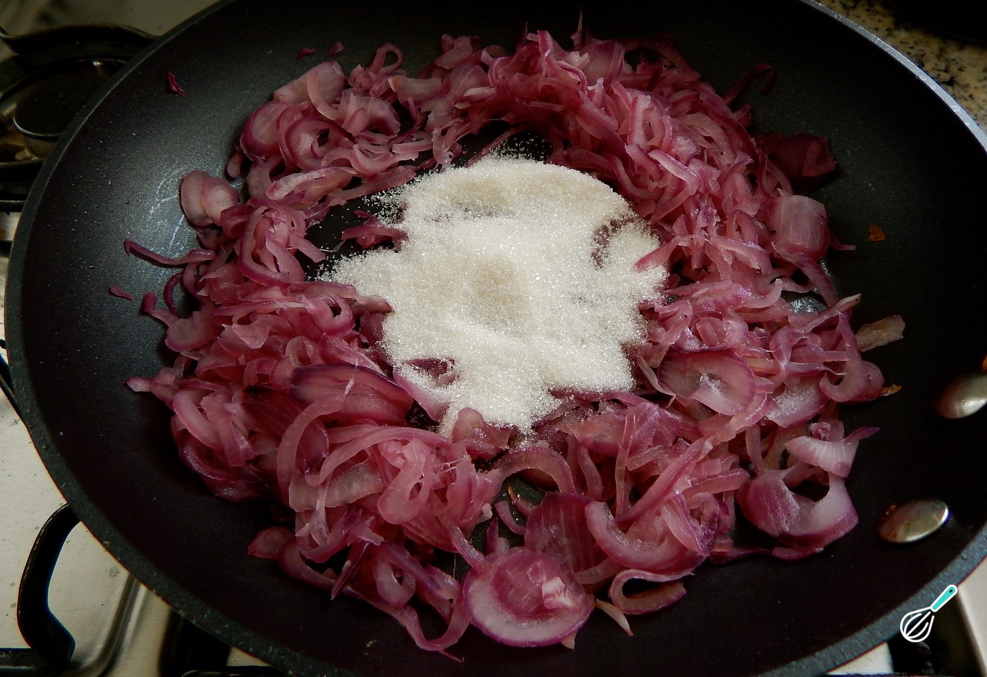 Quando a cebola murchar, acrescente o açúcar e deixe caramelizar um pouco. Adicione os restantes ingredientes, baixe o fogo e mexa de vez em quando até conseguir um molho encorpado.