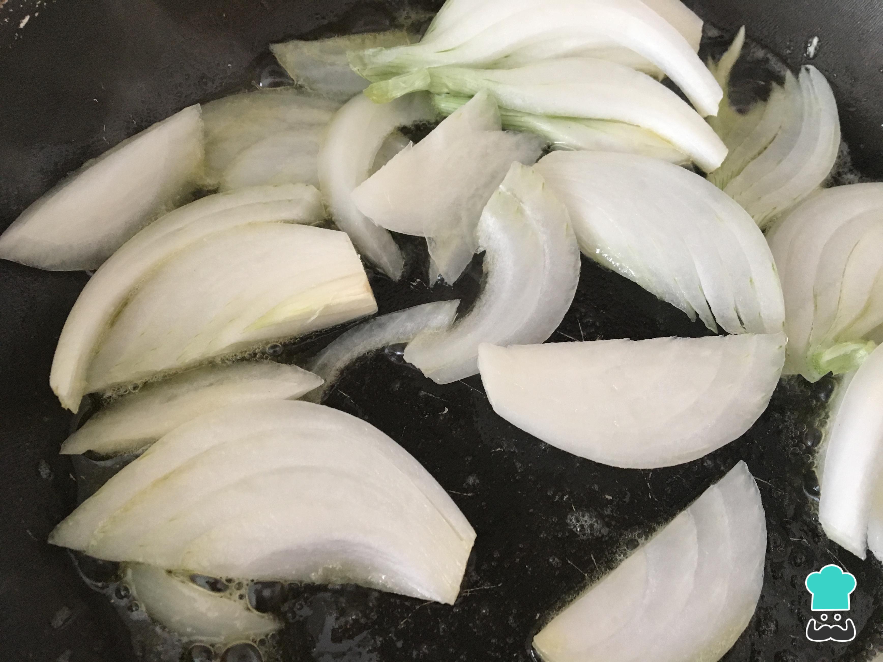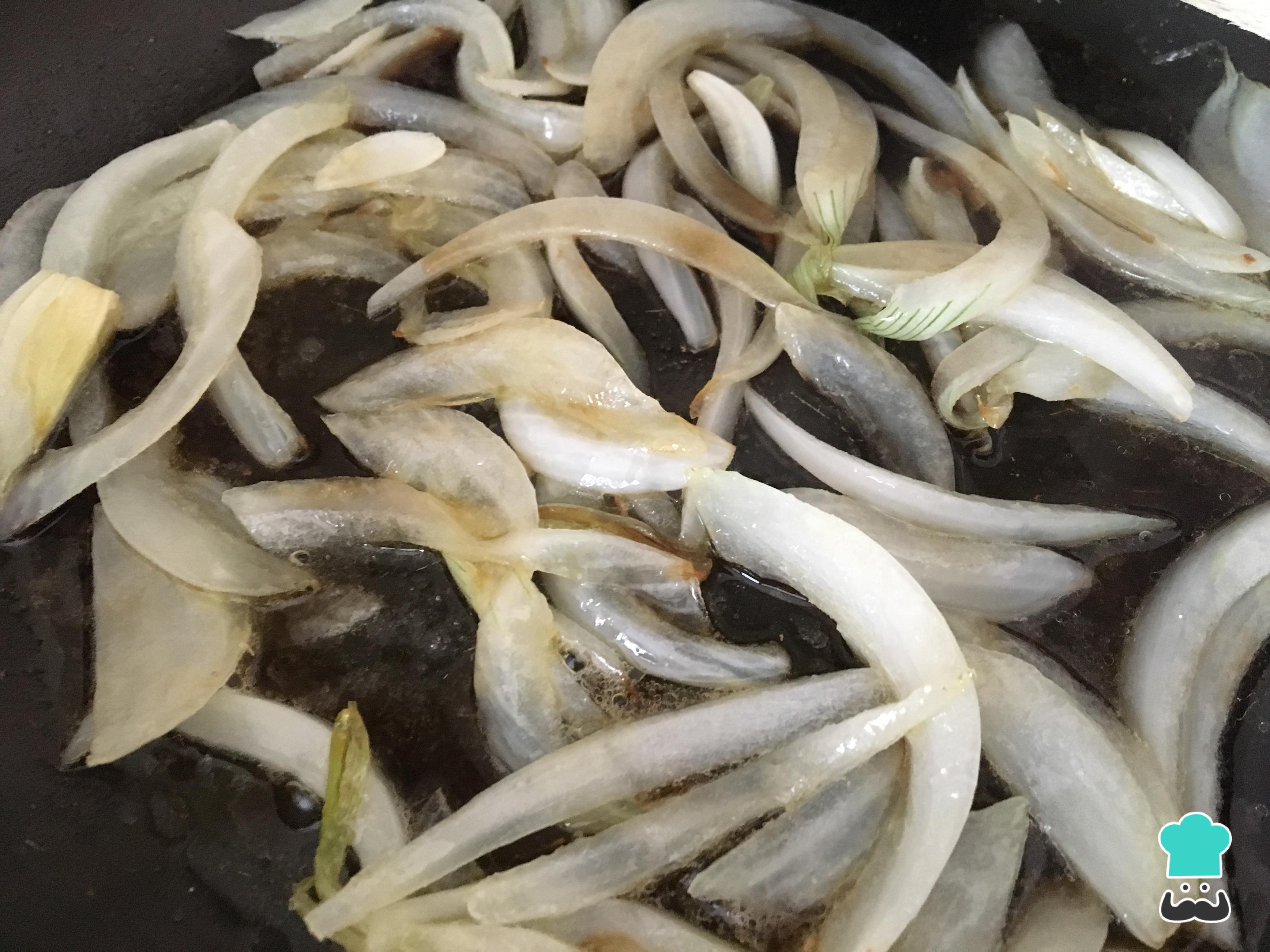 Corte a cebola em tirinhas e refogue na frigideira com um pouco de azeite. Adicione também um pouco de manteiga para conferir mais cremosidade. Junte uma pitada de sal e deixe cozinhar a cebola por 5 minutos em fogo baixo.