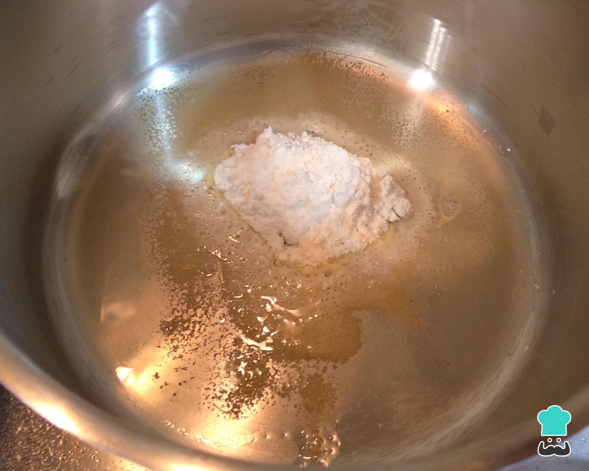 Prepare o molho cheddar começando por preparar um molho branco. Para isso leve ao fogo uma panela com a manteiga e espere derreter. Depois coloque a farinha e mexa até virar uma pasta.