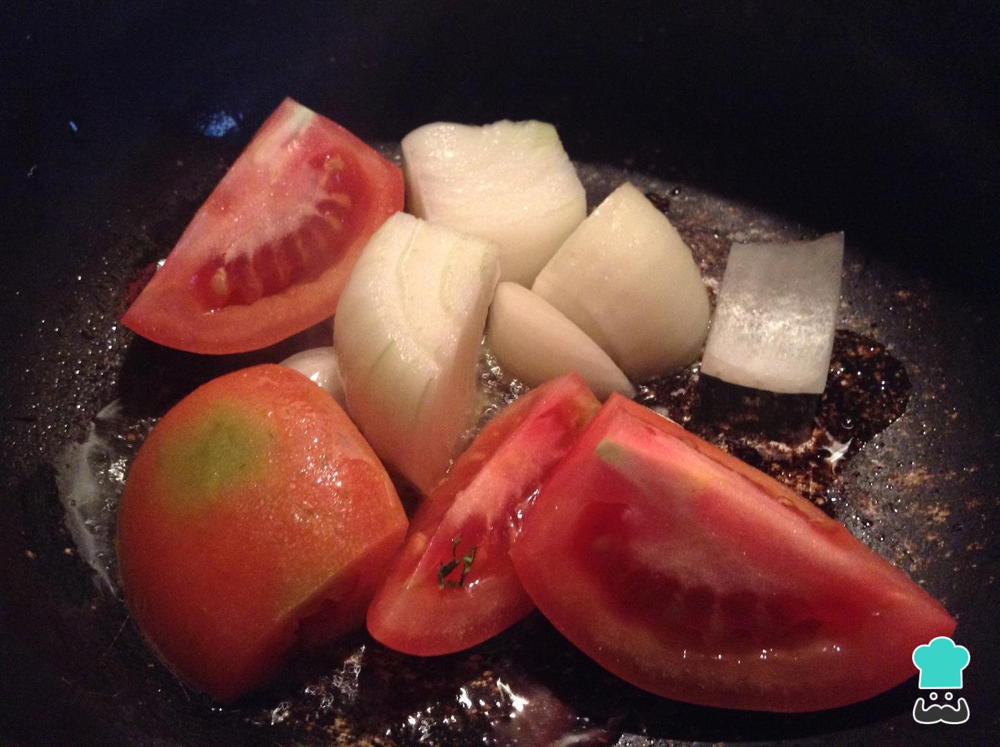 Leve uma panela fogo médio com o azeite de oliva e, uma vez quente, adicione o tomate e a cebola cortados em pedaços.