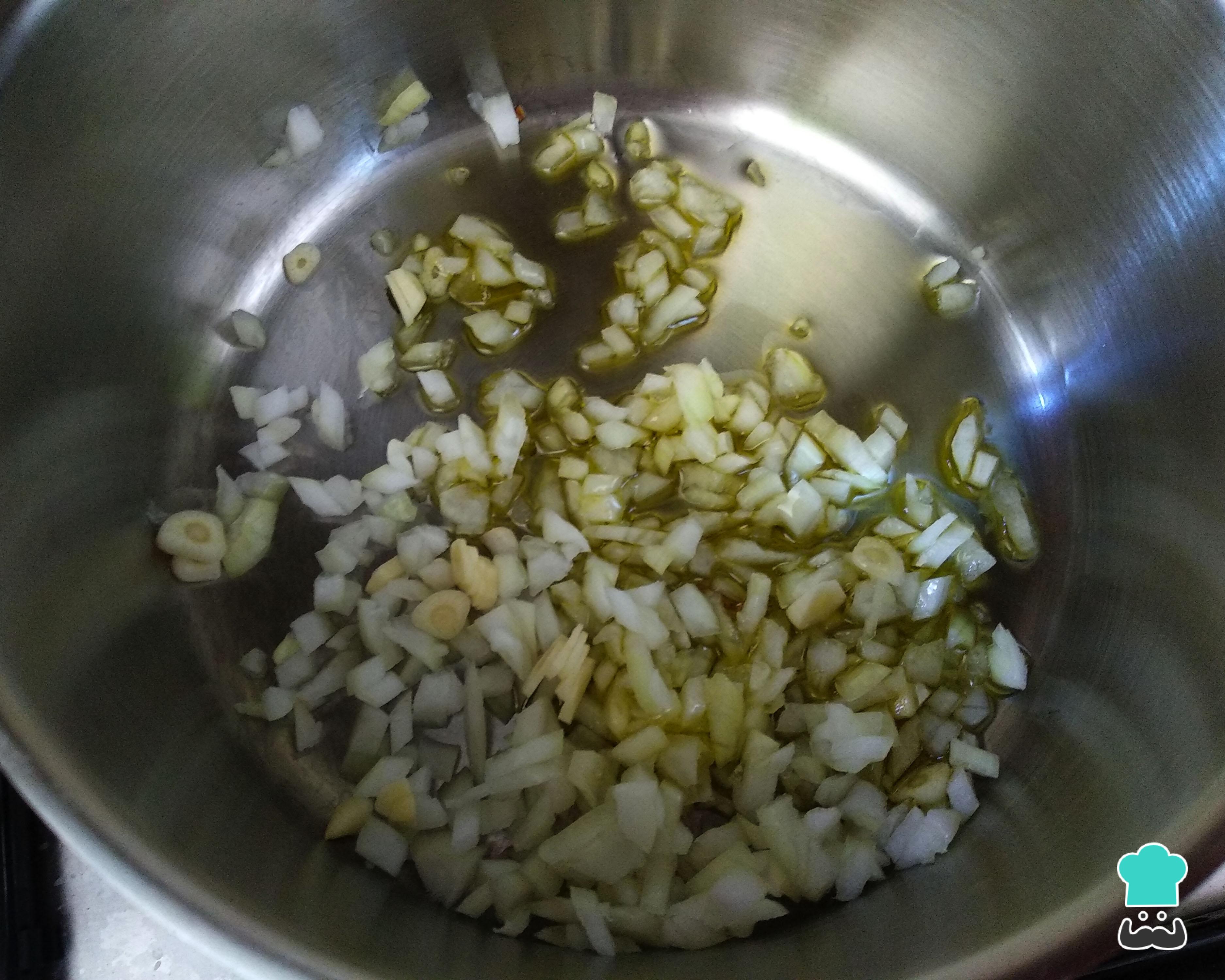 Leve ao fogo médio uma panela com um fio de azeite de oliva ou óleo vegetal e adicione a cebola e os dentes de alhos picados. Deixe por 1-2 minutos ou até a cebola ficar macia.