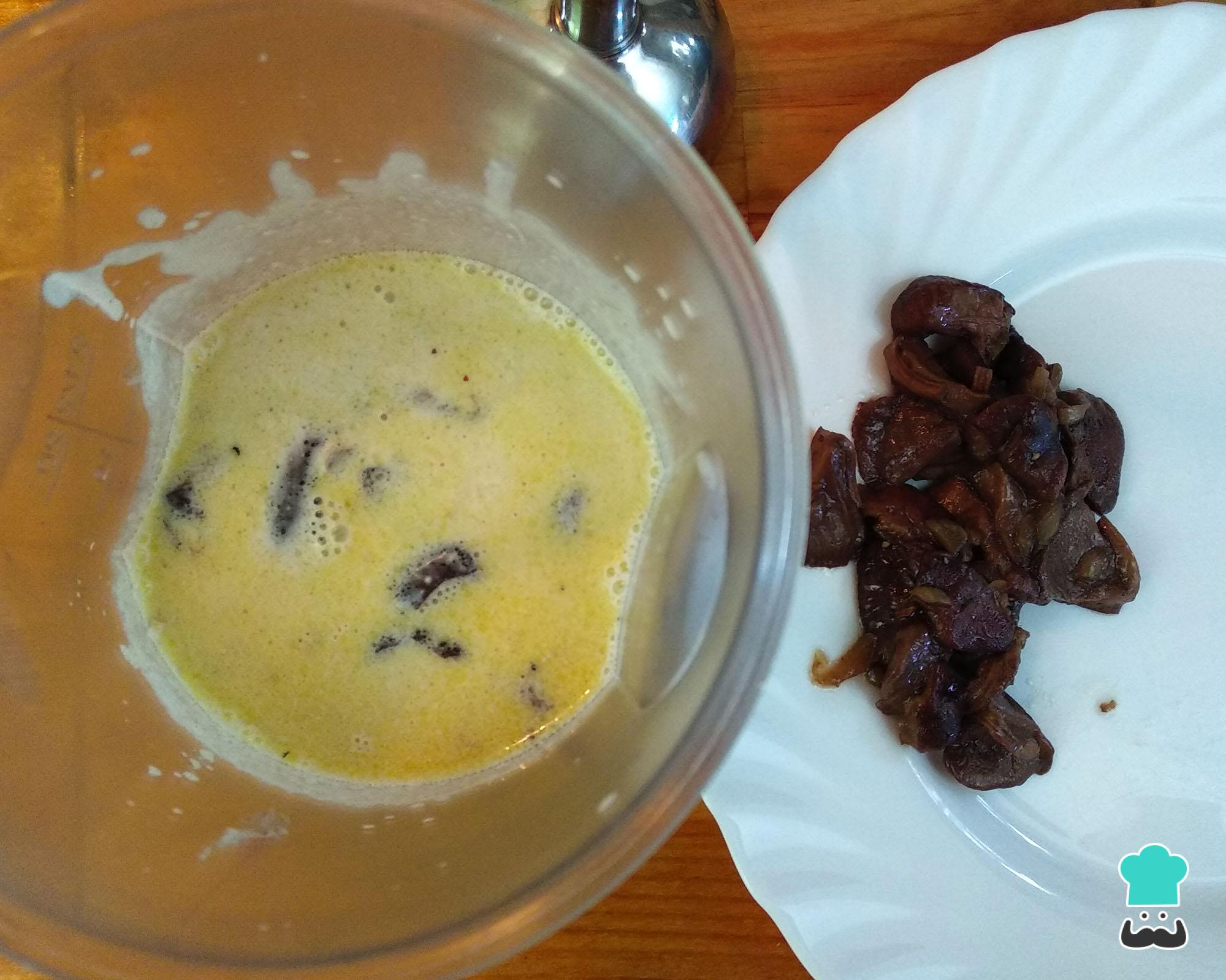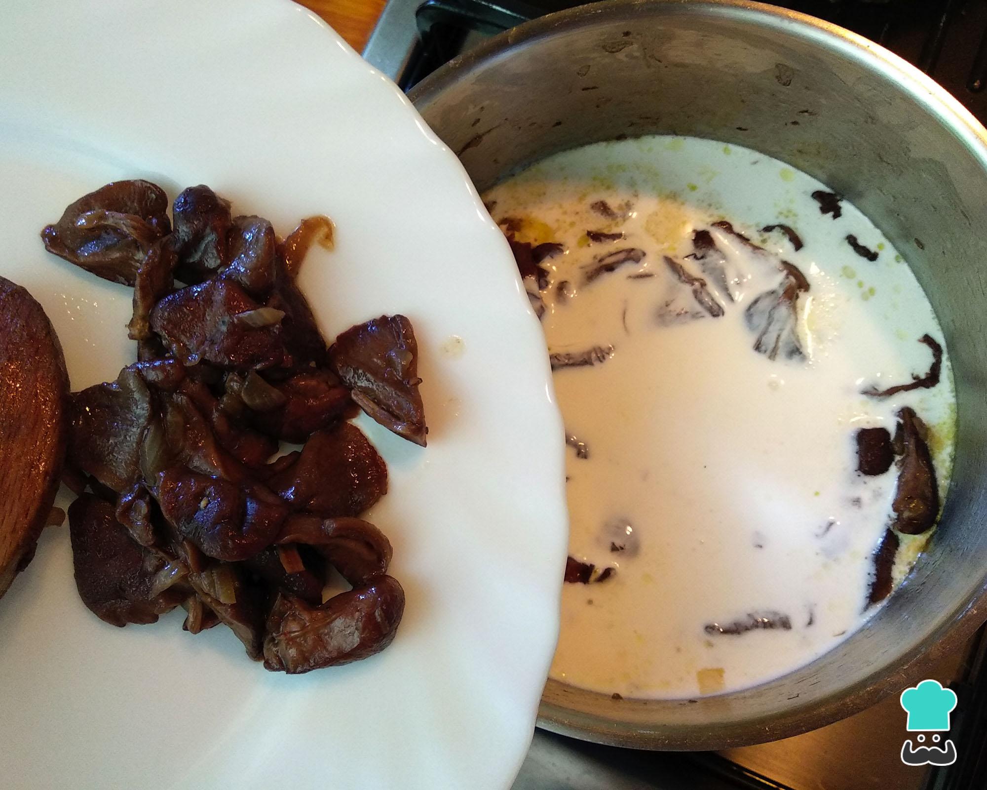 O passo seguinte é retirar um pouco dos cogumelos refogados para um prato e adicionar o creme de leite na panela. Misture o creme de leite com os cogumelos na panela, retire do fogo e deixe esfriar um pouco.