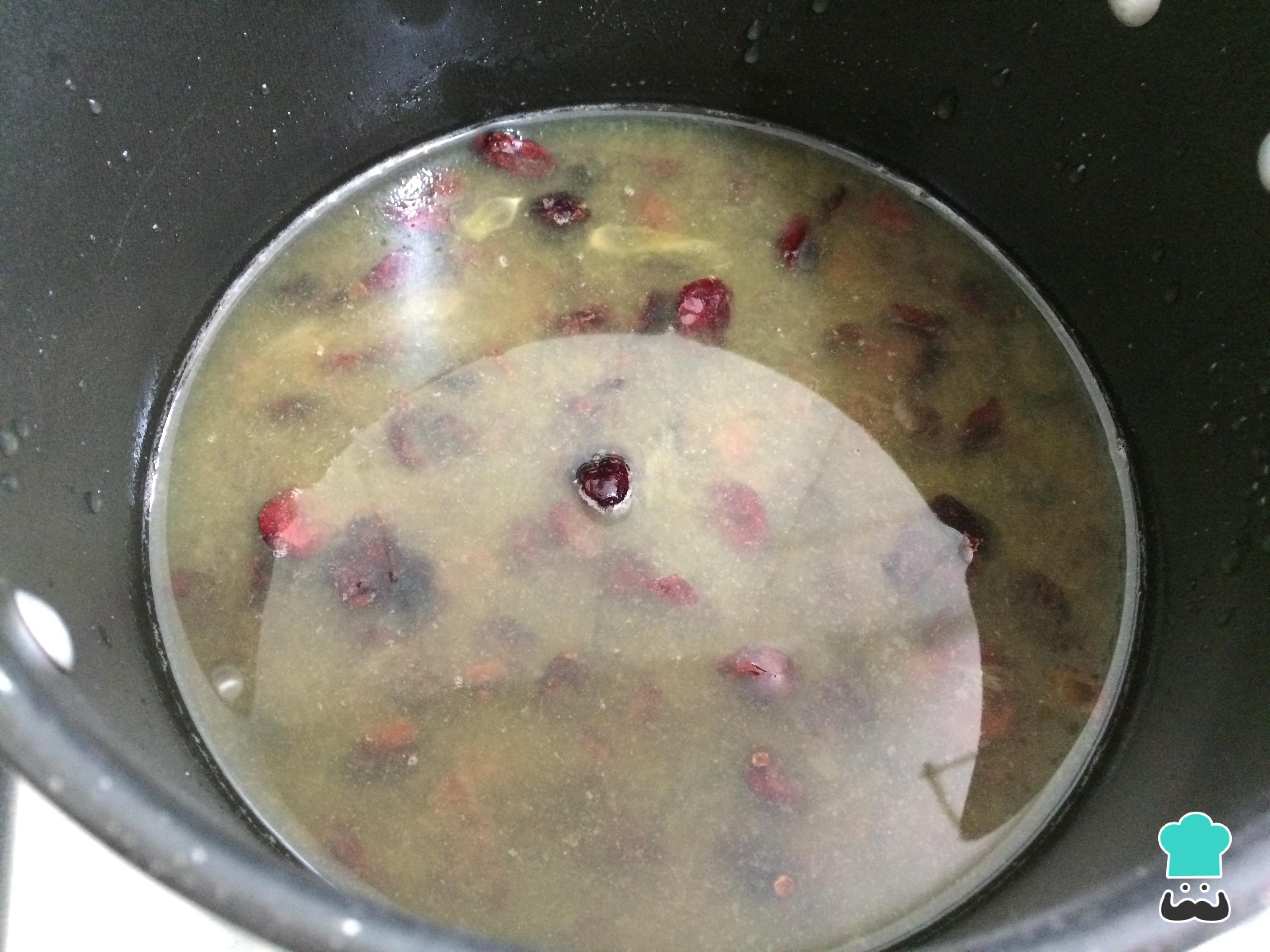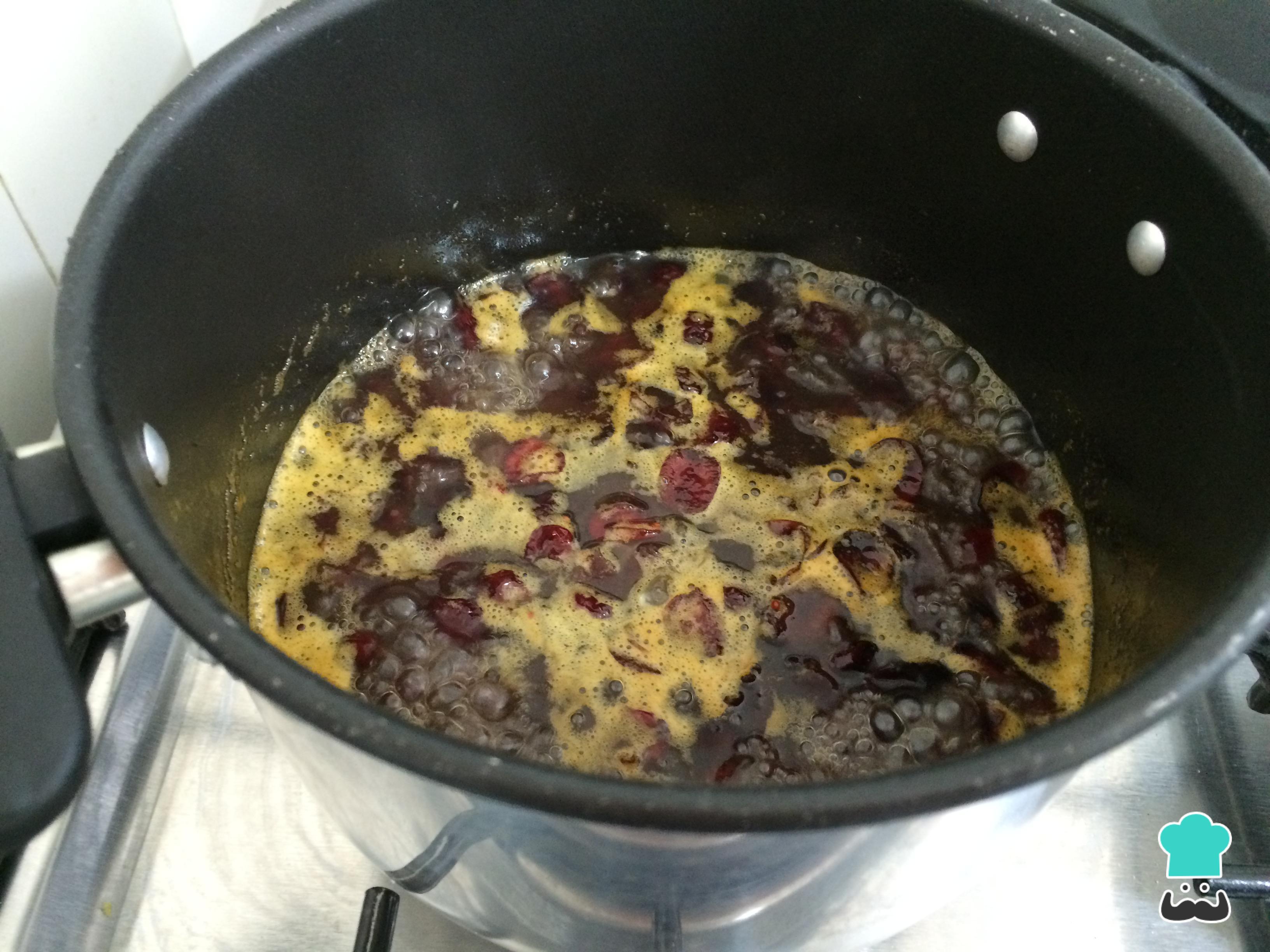Coloque o vinho branco, o suco de laranja e os arandos em uma panela, e cozinhe em fogo baixo para hidratar.