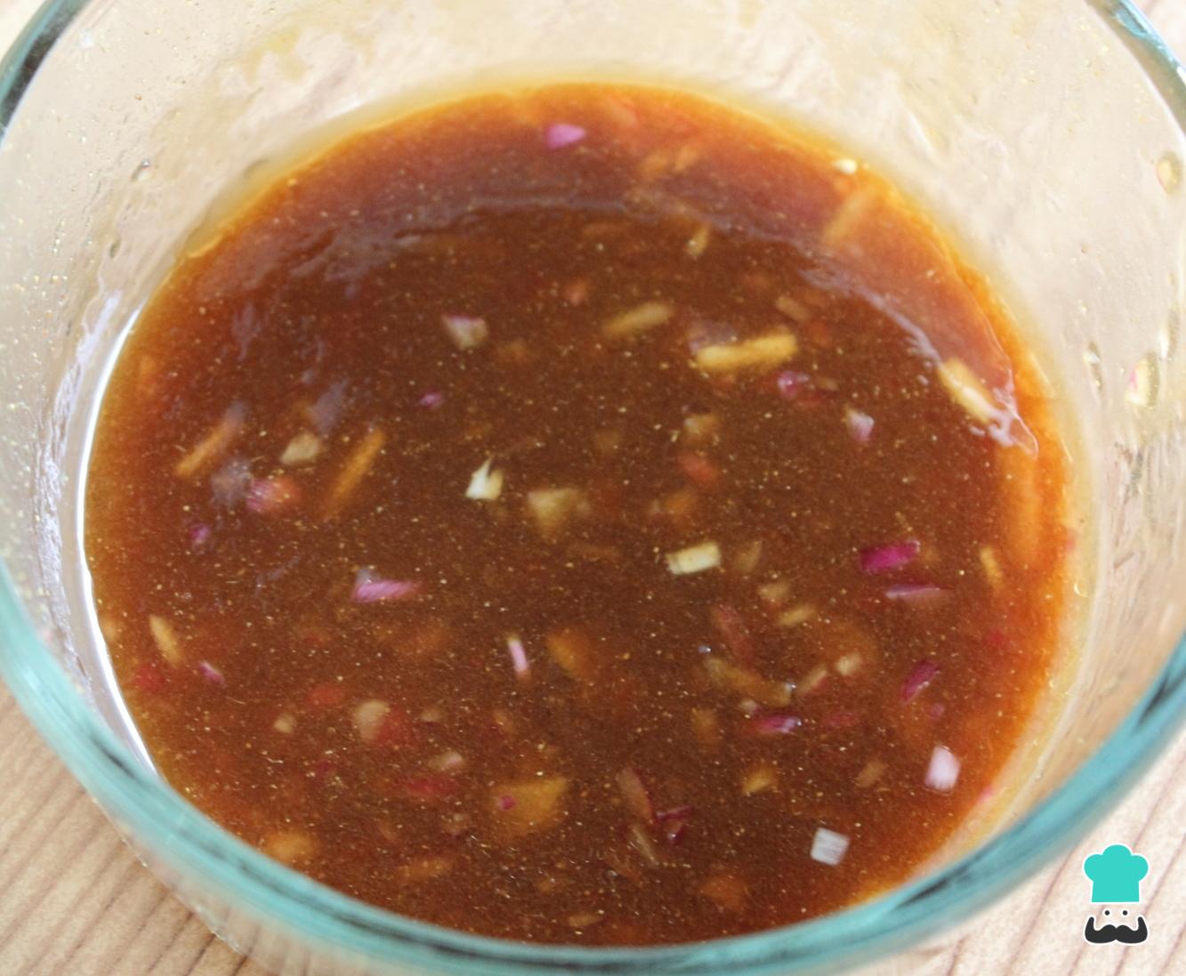 Seguidamente misture muito bem o gengibre, a cebola, o shoyu, a água e o suco de limão em uma tigela. Acerte o sabor com sal e açúcar e está pronto a servir!