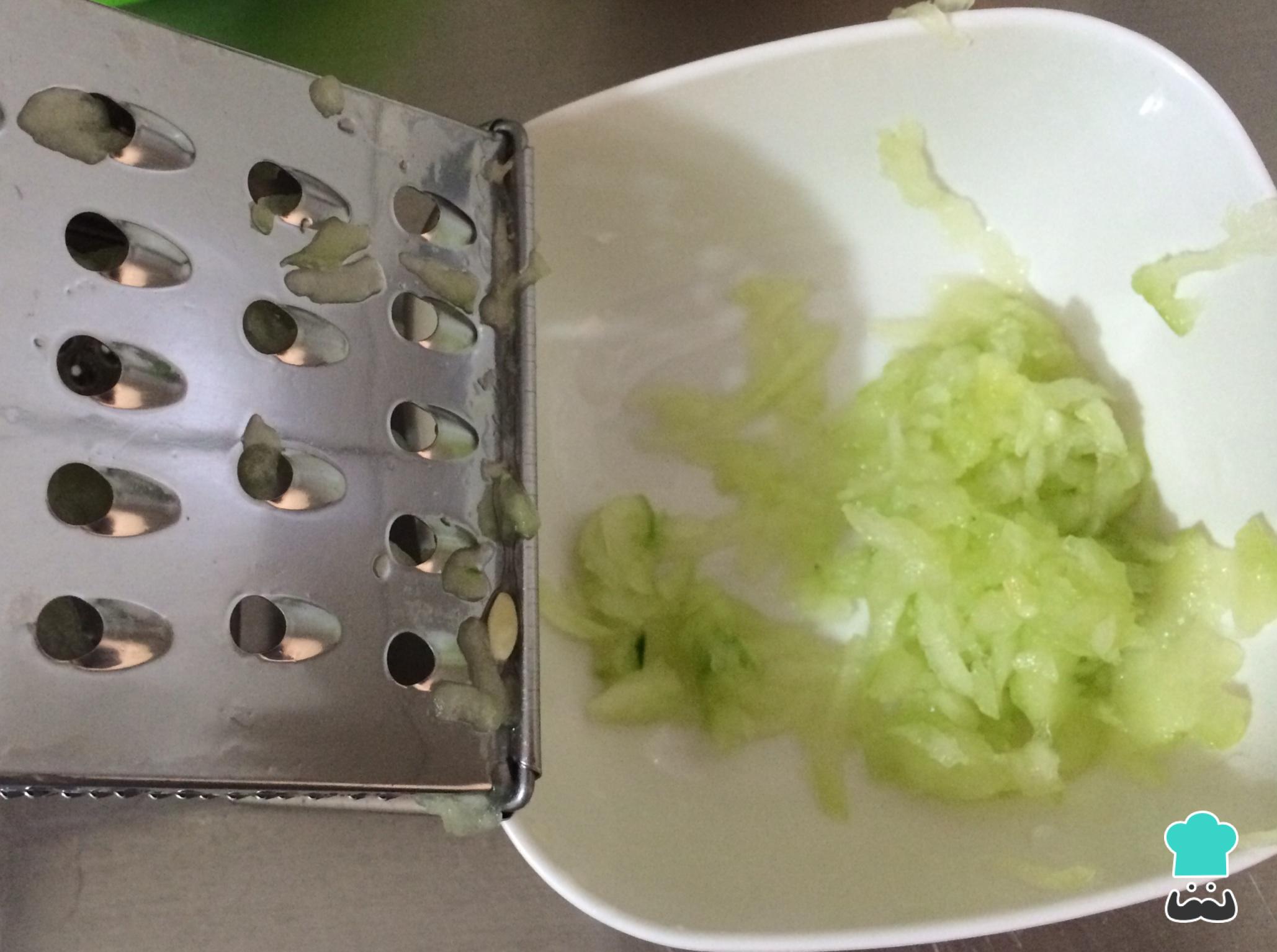 Descasque, retire as sementes e rale o pepino pela parte mais grossa do ralador. Reserve.