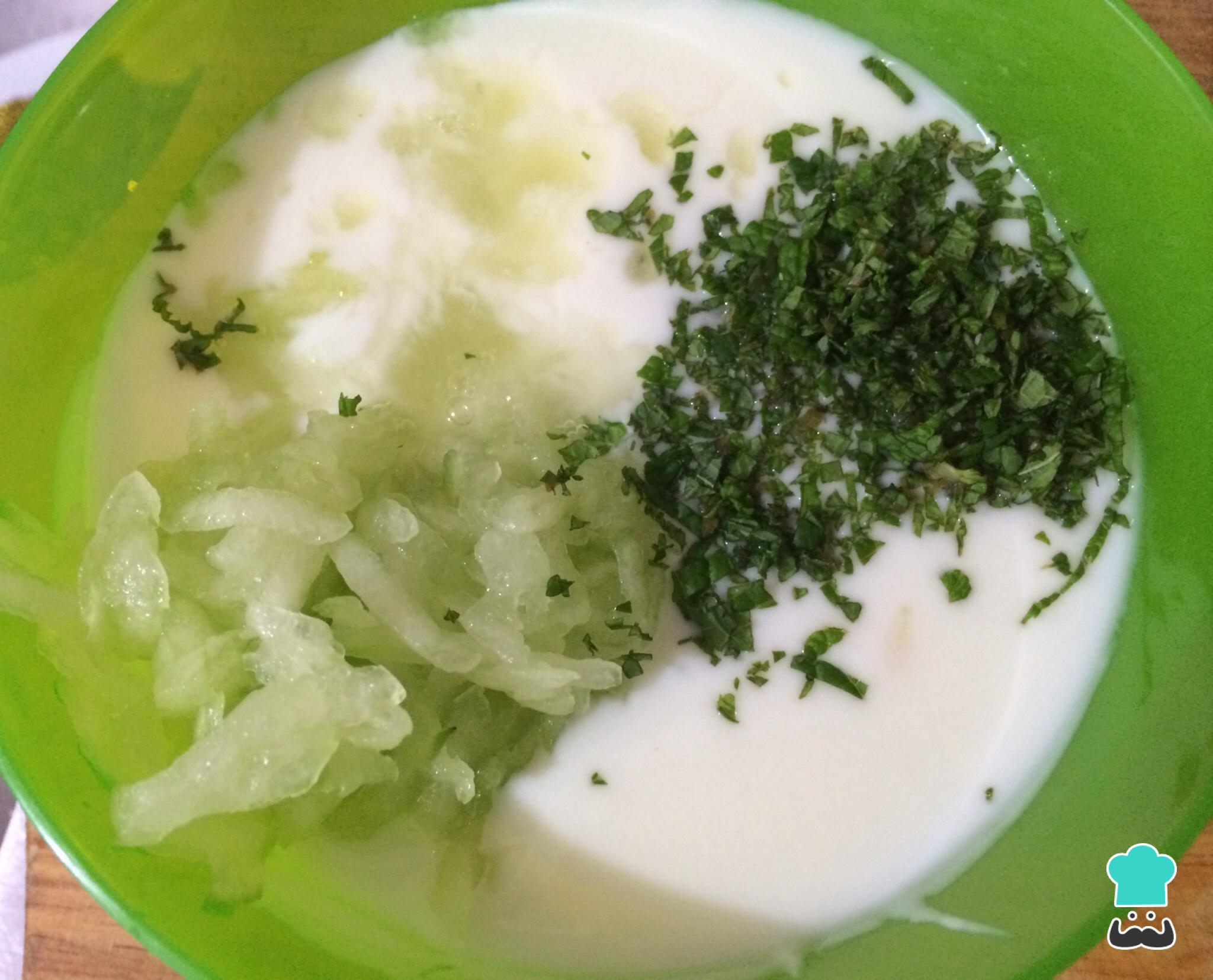 Misture o iogurte com o pepino ralado, o suco do limão e a hortelã picada muito fina.