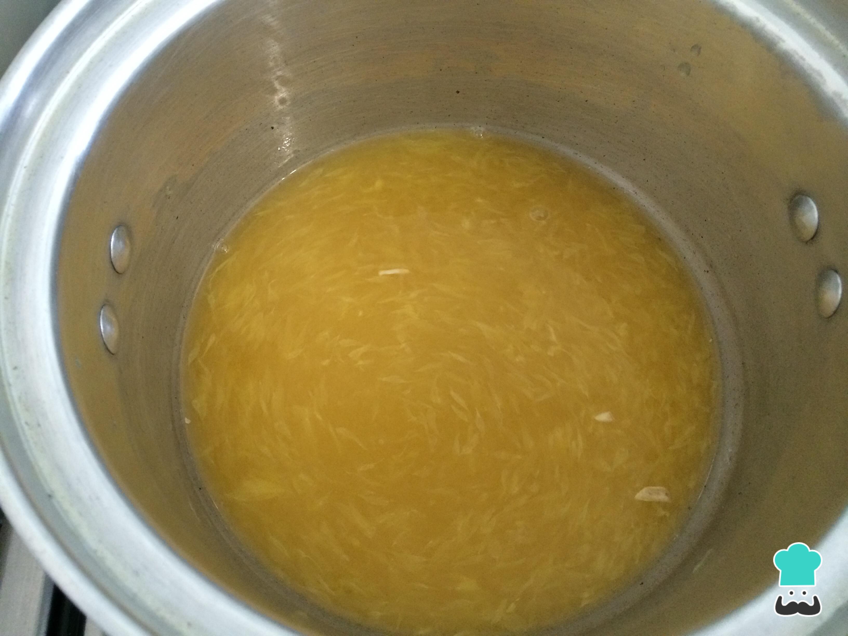 De seguida coloque o suco em uma panela junto com o açúcar e o vinagre, e leve a cozinhar em fogo baixo durante 5 minutos, ou até o açúcar dissolver.