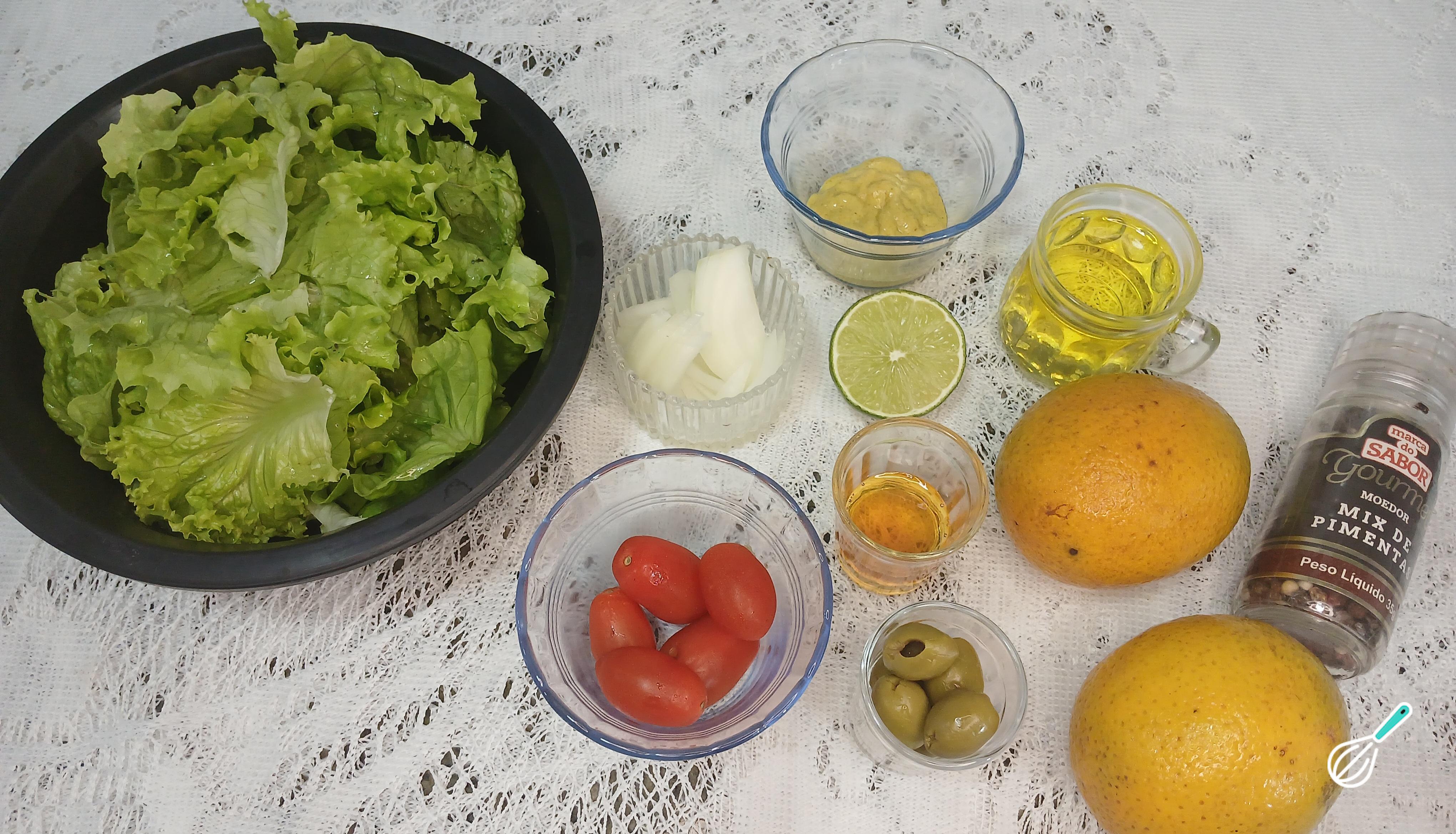 Comece separando os ingredientes para o preparo do seu molho de laranja para salada. Separe as 2 laranjas, a metade de um limão, separe a mostarda, o mel e o azeite. Separe também a alface, os tomates cerejas, as azeitonas e a cebola. Corte a cebola em formato de meia lua ou julienne.