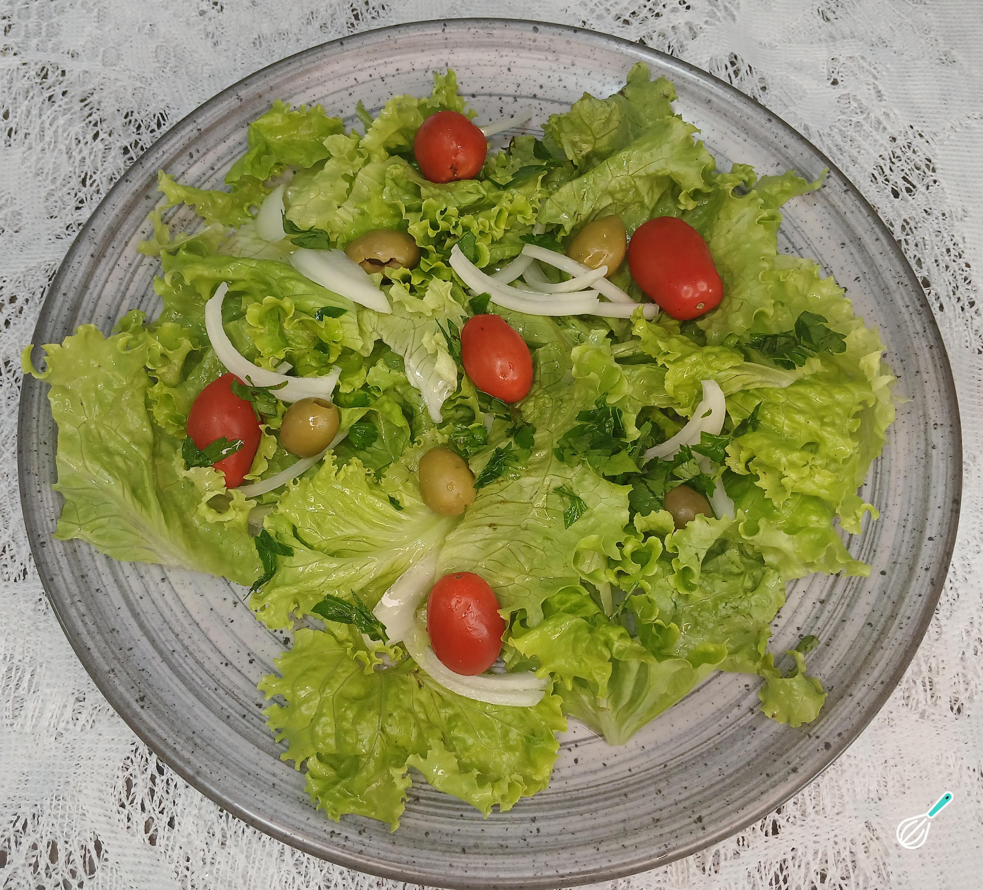Feito isso, monte a salada. Comece lavando a alface. Lave e higieniza bem em água corrente. Retire as folhas dos talos e deixe por 3 minutos em uma tigela com água e 3 gotas de cloro. Depois disso retire e lave. Em um prato, monte a salada. Coloque as folhas de alface, os tomates cerejas inteiros, assim como as azeitonas. Coloque as fatias de cebola branca e o alho frito (se decidir usar). Adicione sal e pimenta.