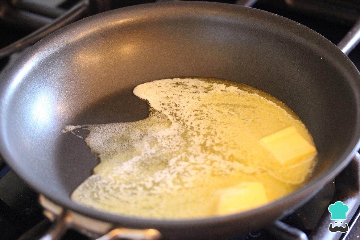 Preparar o molho de manteiga e sálvia é muito fácil e rápido! O primeiro passo é derreter a manteiga numa frigideira em fogo médio.
