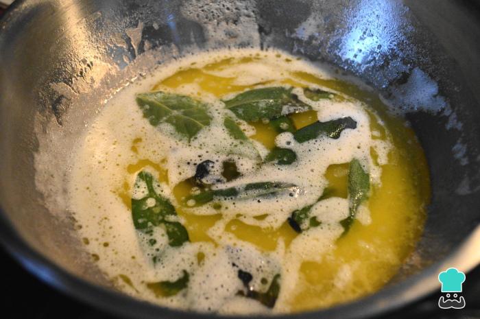 Quando começar a espumar e ficar um pouco mais escura, acrescente as folhas de sálvia. Cozinhe as folhas por alguns segundinhos, de um lado e do outro, de forma a que soltem o sabor.