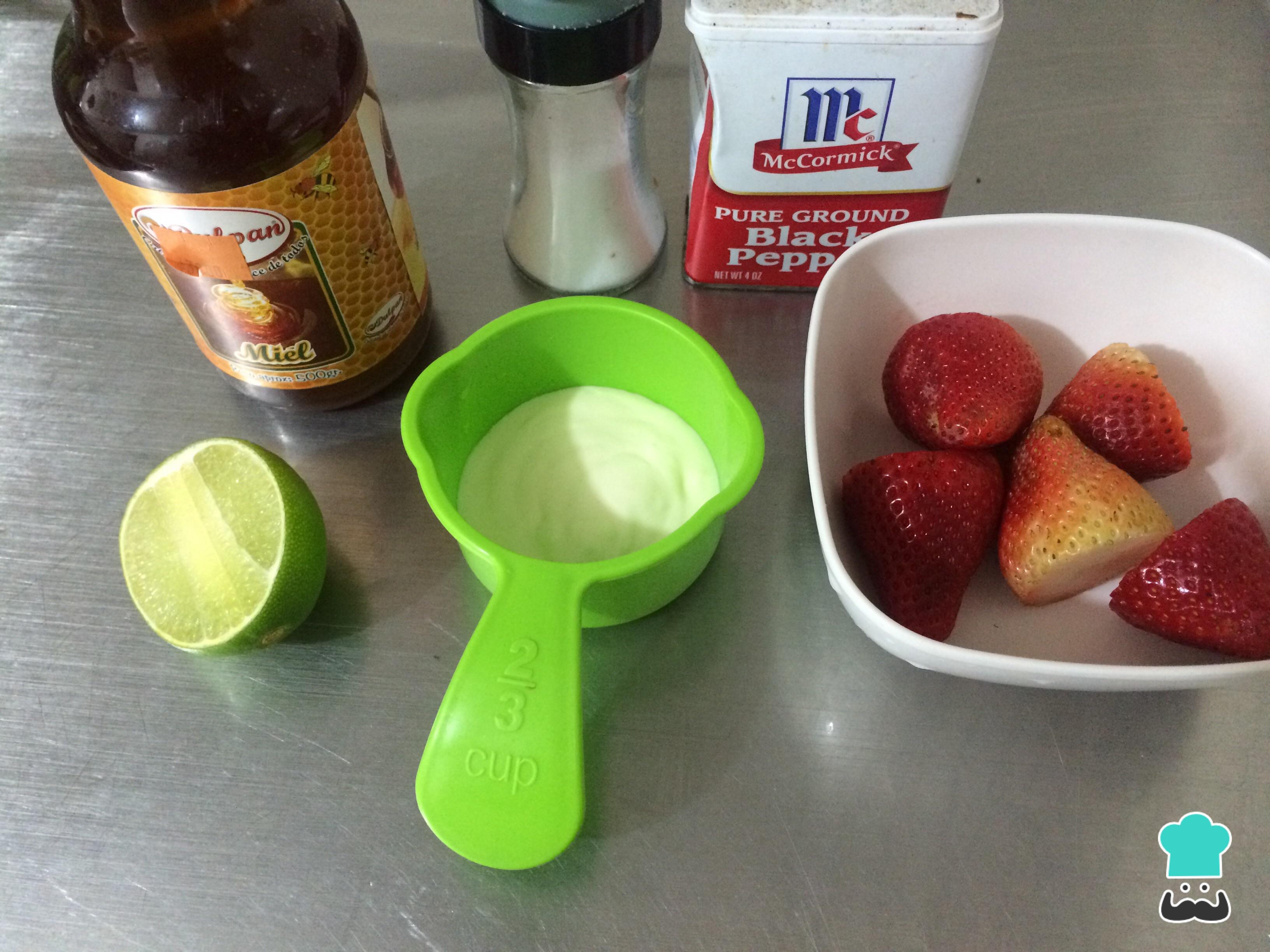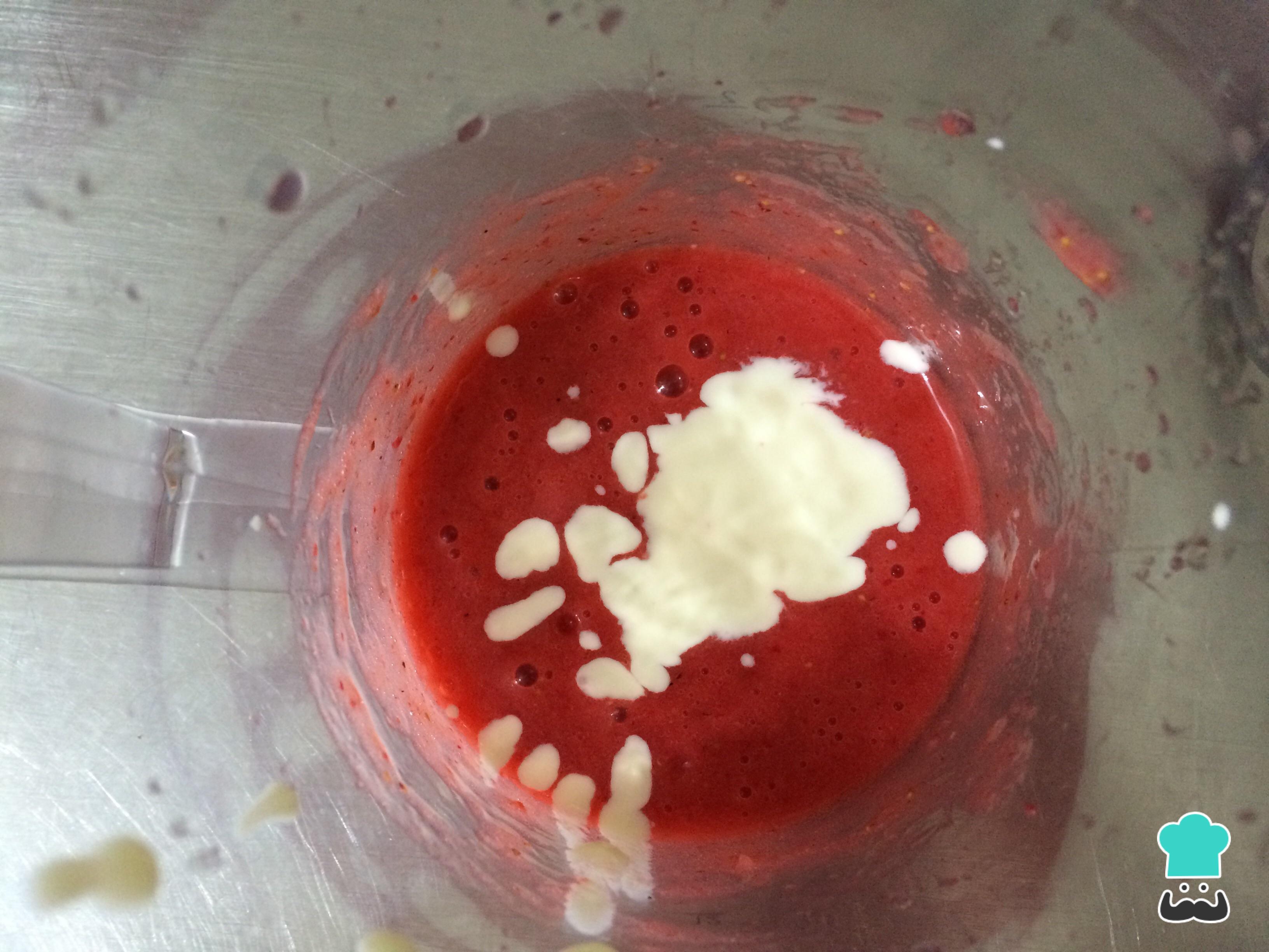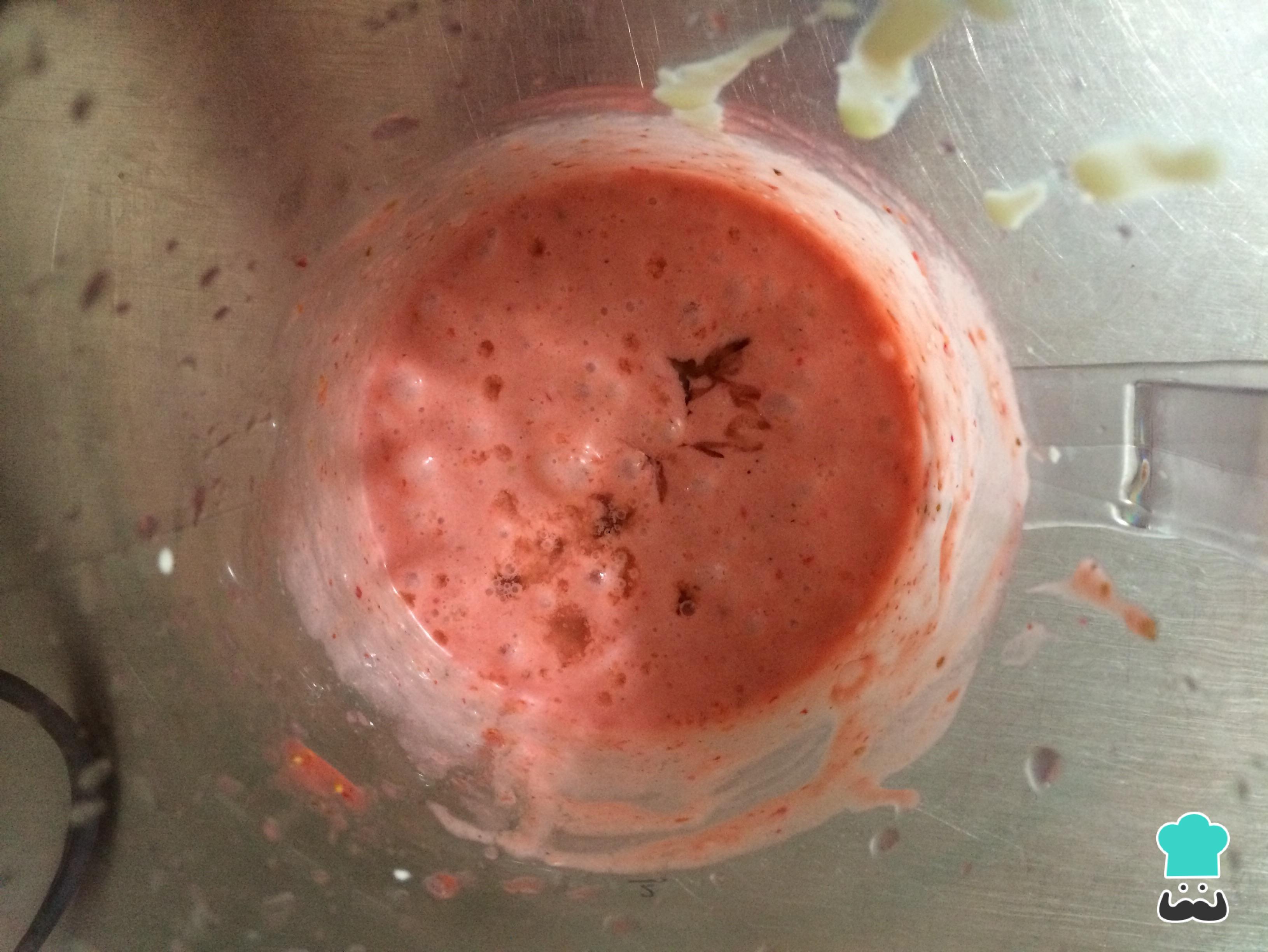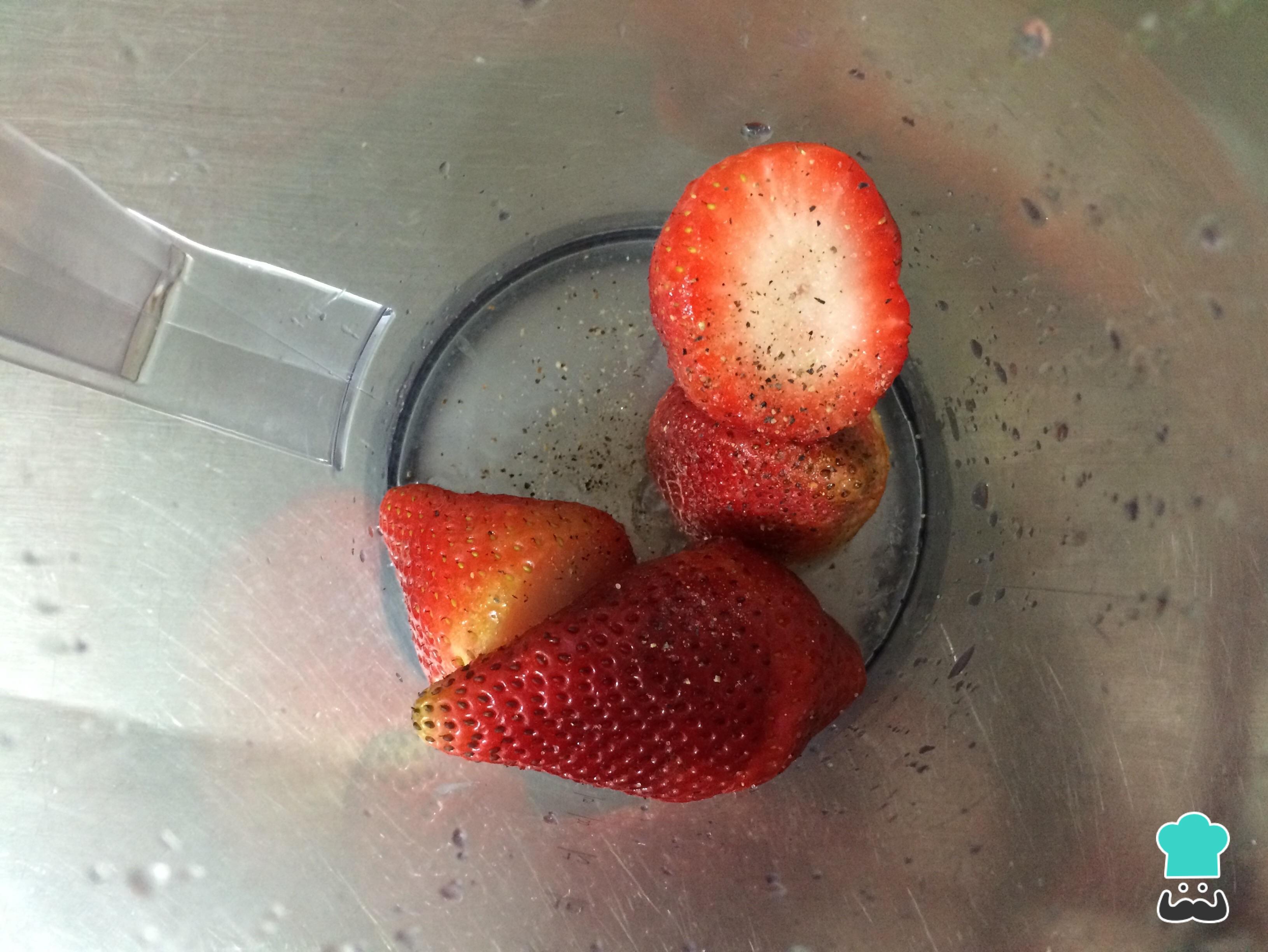 Em seguida bata os morangos no liquidificador ou com um mixer, e temperados com sal, pimenta e suco de limão a gosto. O resultado deverá ser um purê de morango homogêneo.