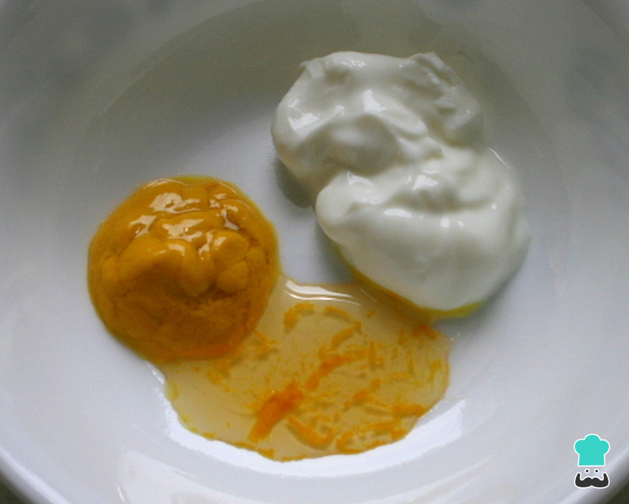 Preparar molho de mostarda é muito fácil! Comece por colocar o iogurte, a mostarda e o mel um uma tigela.