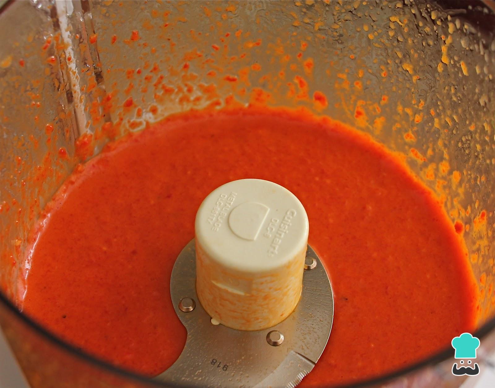 Leve a a mistura ao liquidificador ou processador de alimentos e bata enquanto junta o vinagre branco aos poucos. Retire do aparelho e peneire, espremendo a mistura com uma colher de pau.