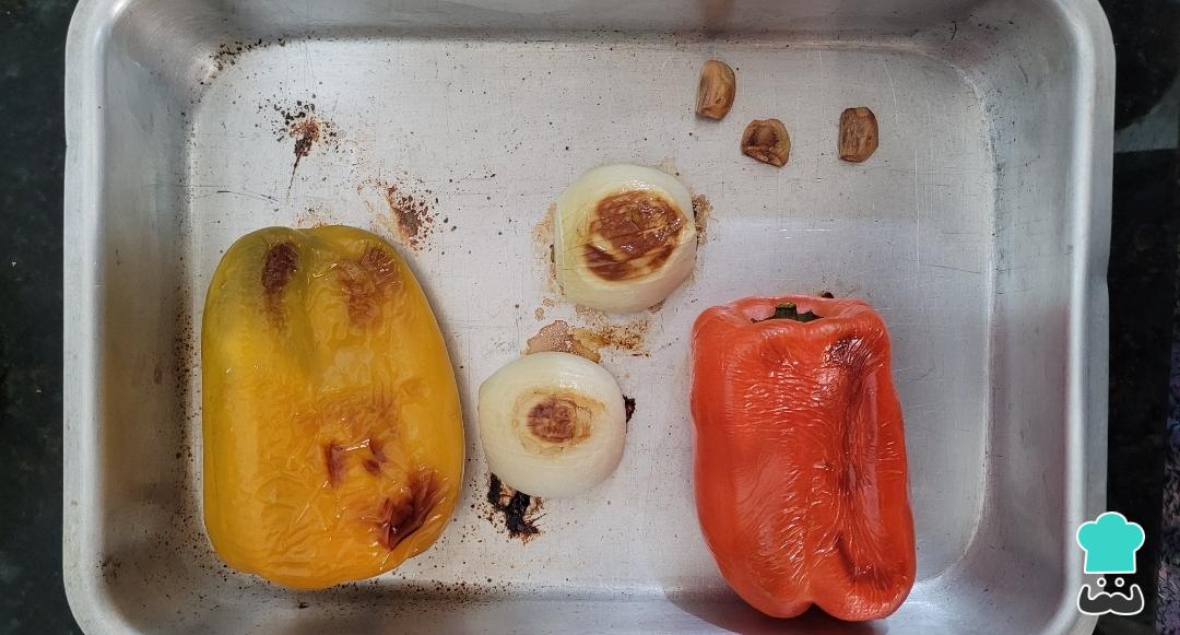 Comece com os ingredientes que precisam ir ao forno. Unte uma forma com óleo e coloque os pimentões, a cebola cortada ao meio e os dentes de alho sem casca. Deixe por 30 min, a 210 graus.