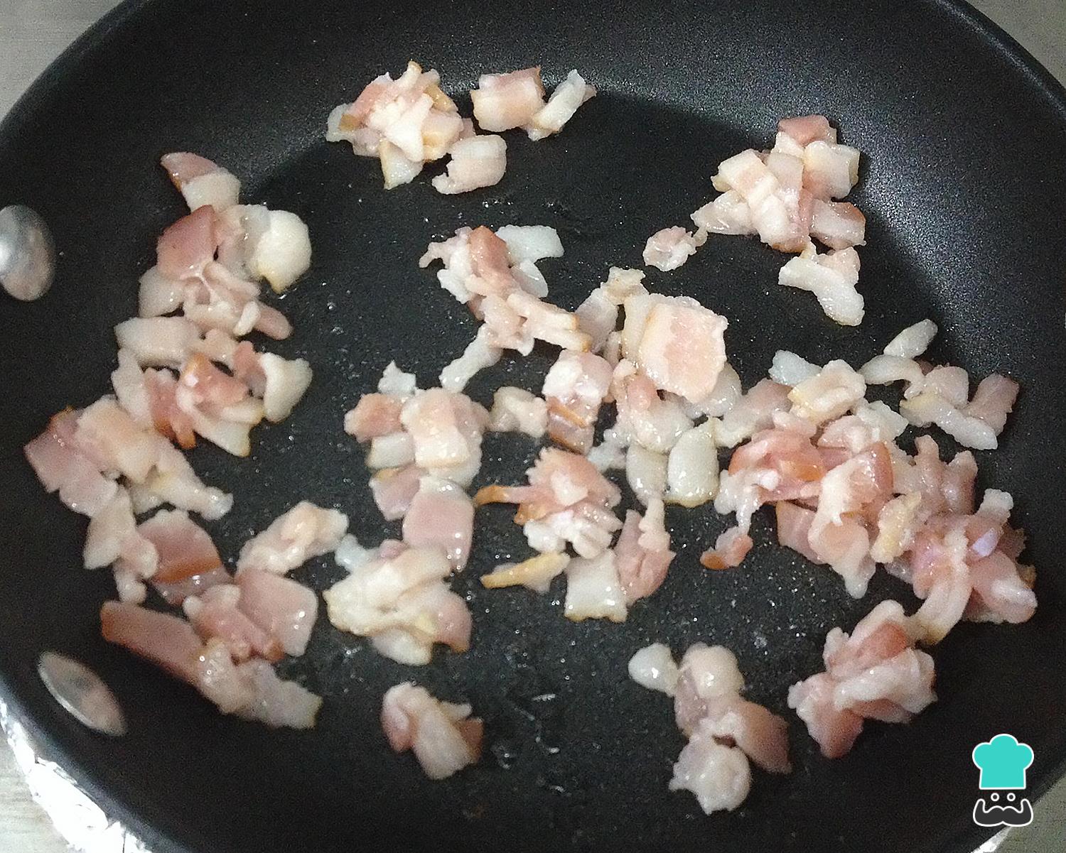 Para tornar o seu molho para capeletti ainda mais gostoso comece por fritar o bacon em uma frigideira no fogo médio-baixo, de forma a soltar a gordura.