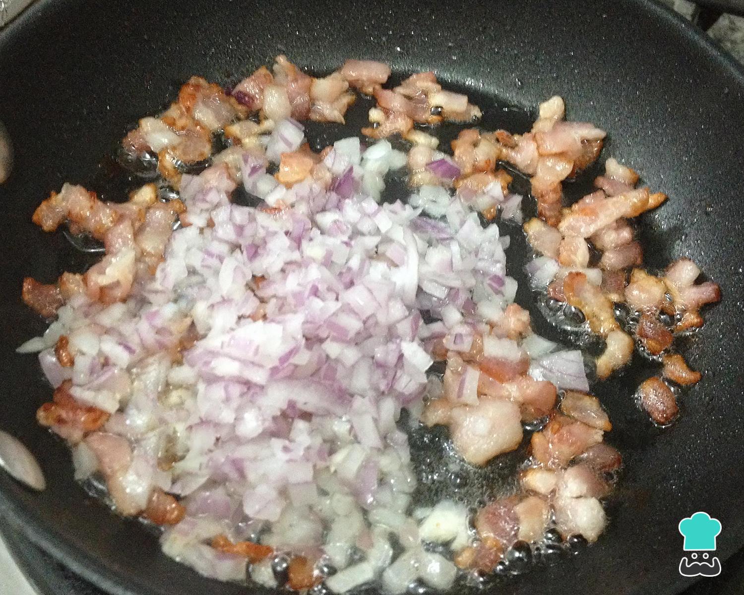 Quando o bacon estiver dourado acrescente a cebola picadinha e refogue até ficar macia.