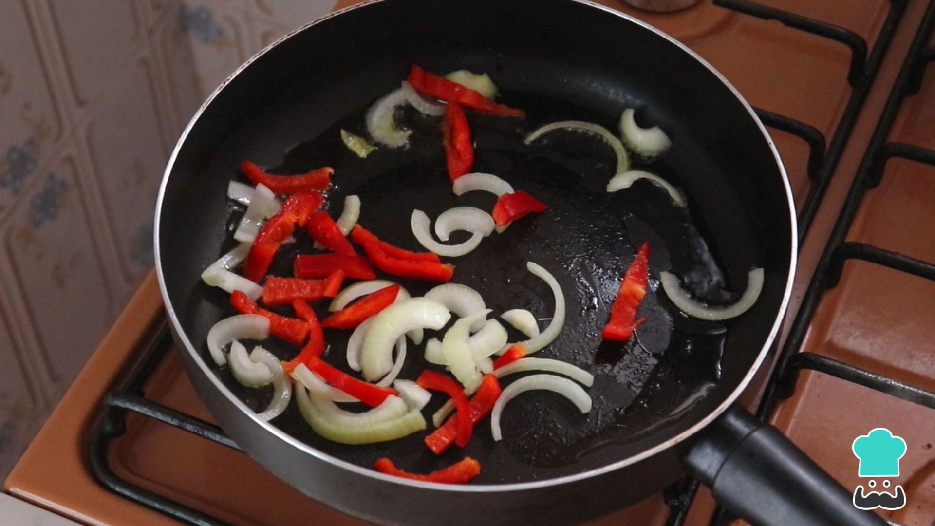 Em seguida aqueça uma panela e despeje o azeite. Acrescente a cebola cortada em meia lua e o pimentão cortado em tiras e deixe dourar.