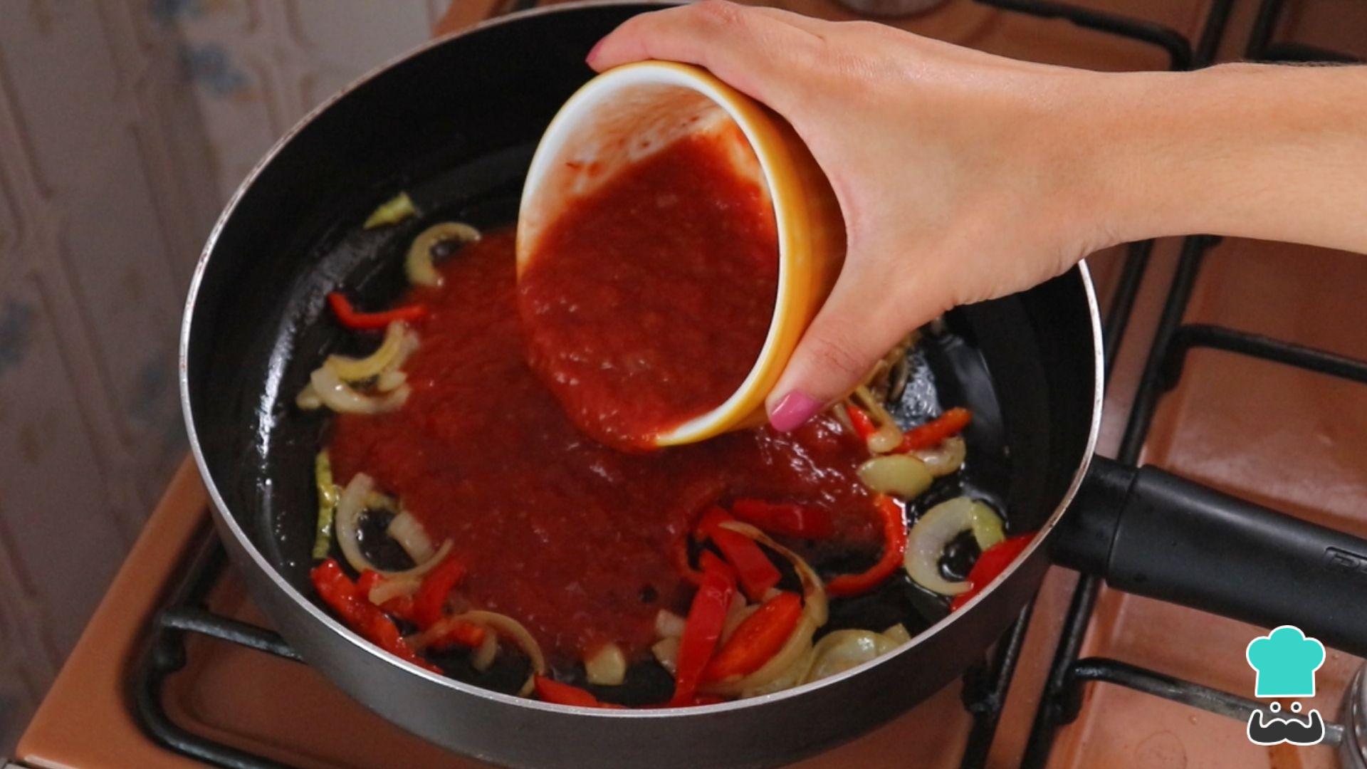 Quando a cebola estiver dourada, despeje o molho de tomate, misture e deixe pegar gosto por mais ou menos 3 minutos, mexendo de vez em quando para não queimar.