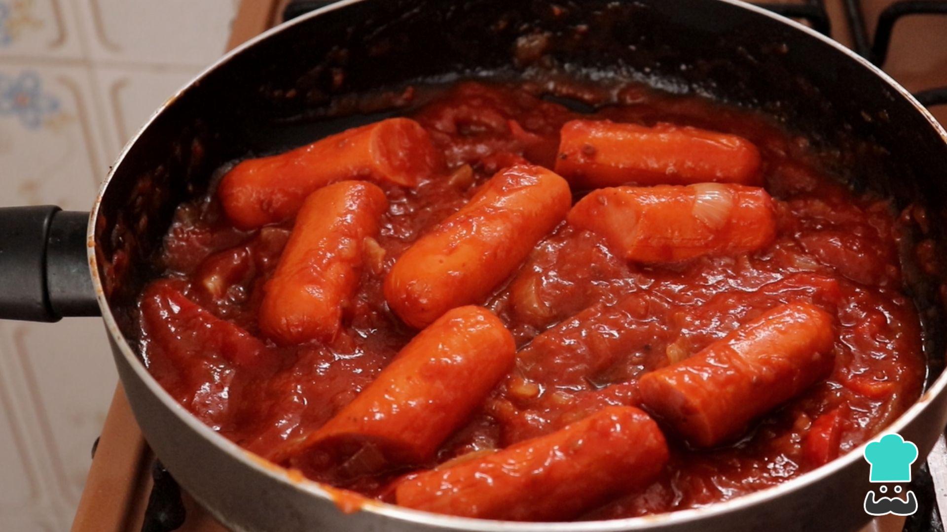 Finalize acrescentando as salsichas já cozidas e cortadas ao meio e deixe pegando gosto por mais 2 minutos.