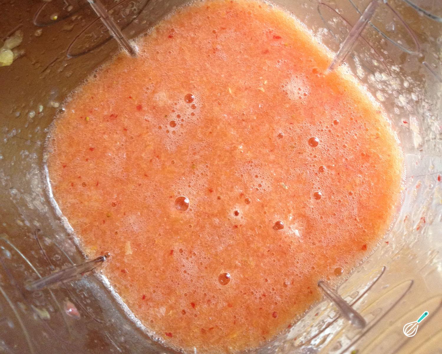 Para começar este molho para churrasco cremoso, no liquidificador bata os tomates sem sementes, a cebola, o suco de limão, o alho, o ketchup, o shoyu ou molho inglês, a páprica picante e o óleo. Bata muito bem até homogeneizar.