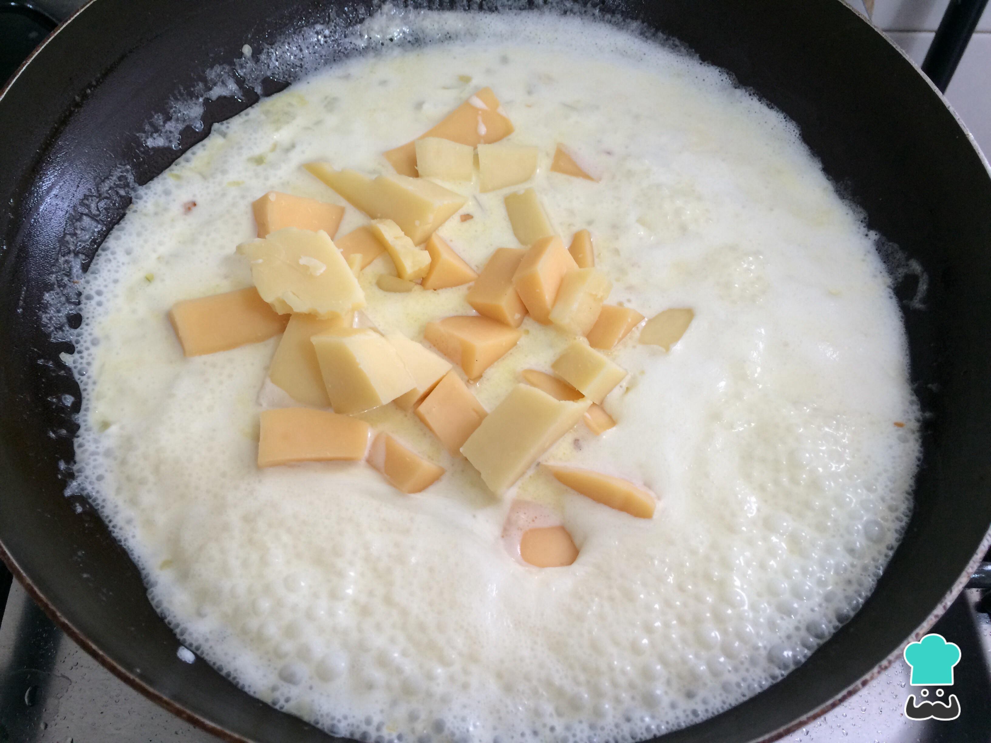 Acrescente o creme de leite, o leite, os queijos cheddar e gruyère cortados em pedaços. Misture tudo para que os queijo derretam.