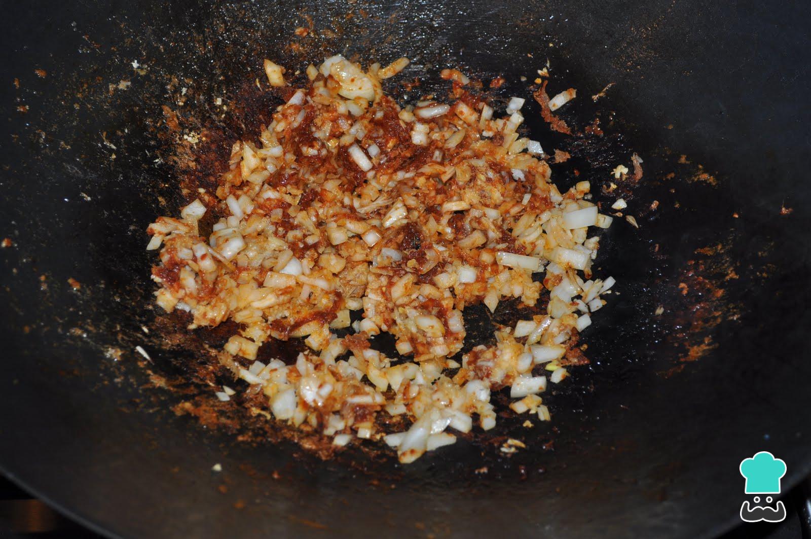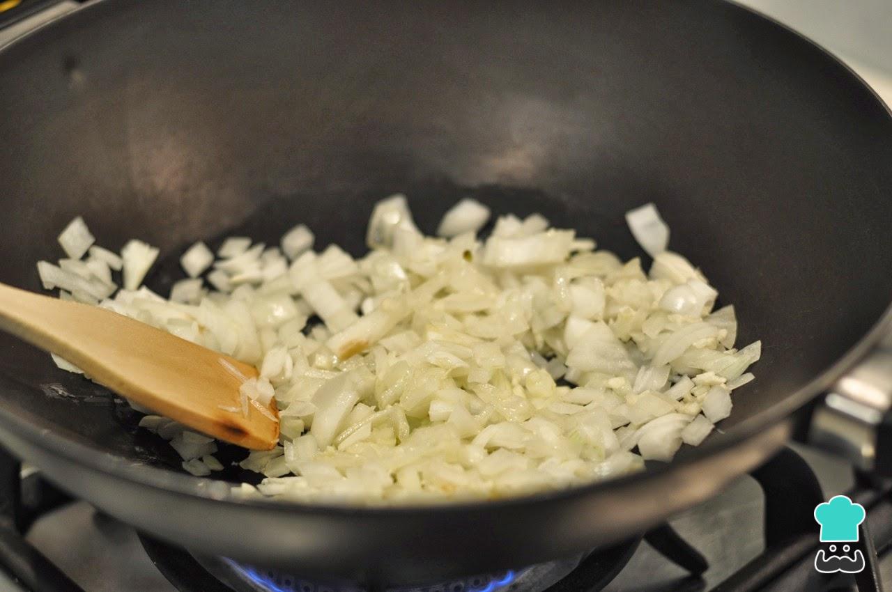O primeiro passo para fazer este molho de vinho tinto para carne é picar a cebola e o alho em pequenos cubinhos. Refogue os dois ingredientes em uma frigideira com uma colher de chá de óleo por 5 minutos.