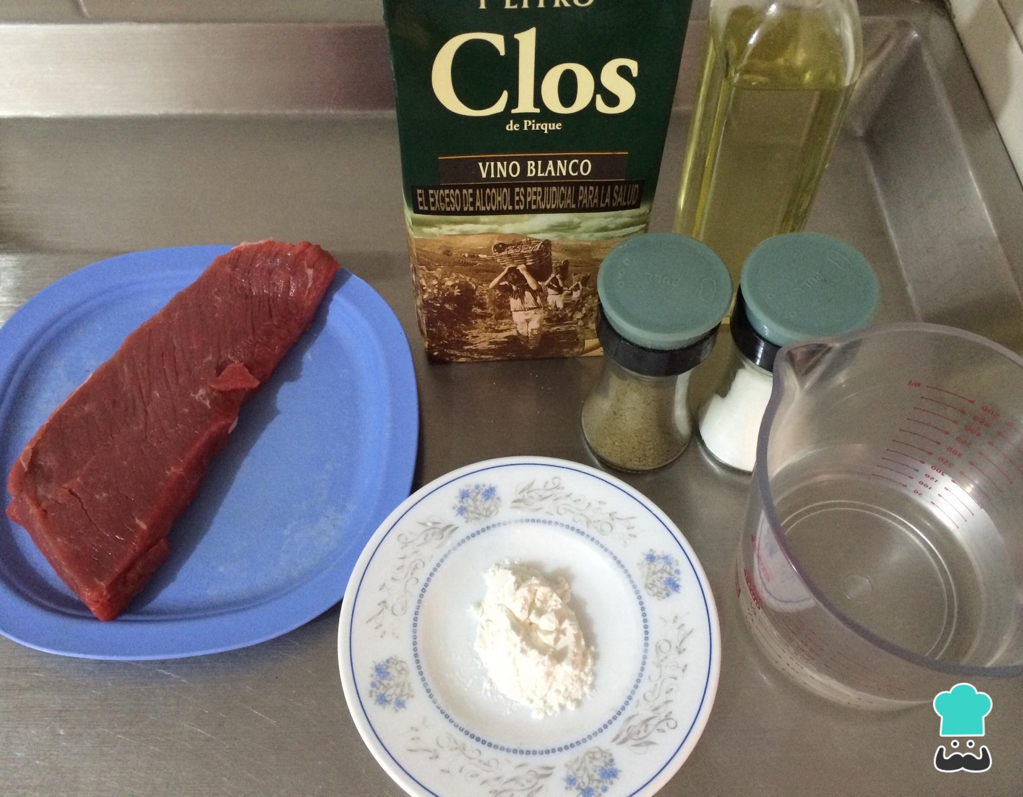 Retire o filé de carne e comece preparando o molho gravy:adicione à frigideira o vinho branco e, com a ajuda de uma espátula, mexa para soltar os sucos e gorduras da carne que ficaram grudados. Cozinhe em fogo médio até o álcool evaporar, adicione a água e espere ferver.