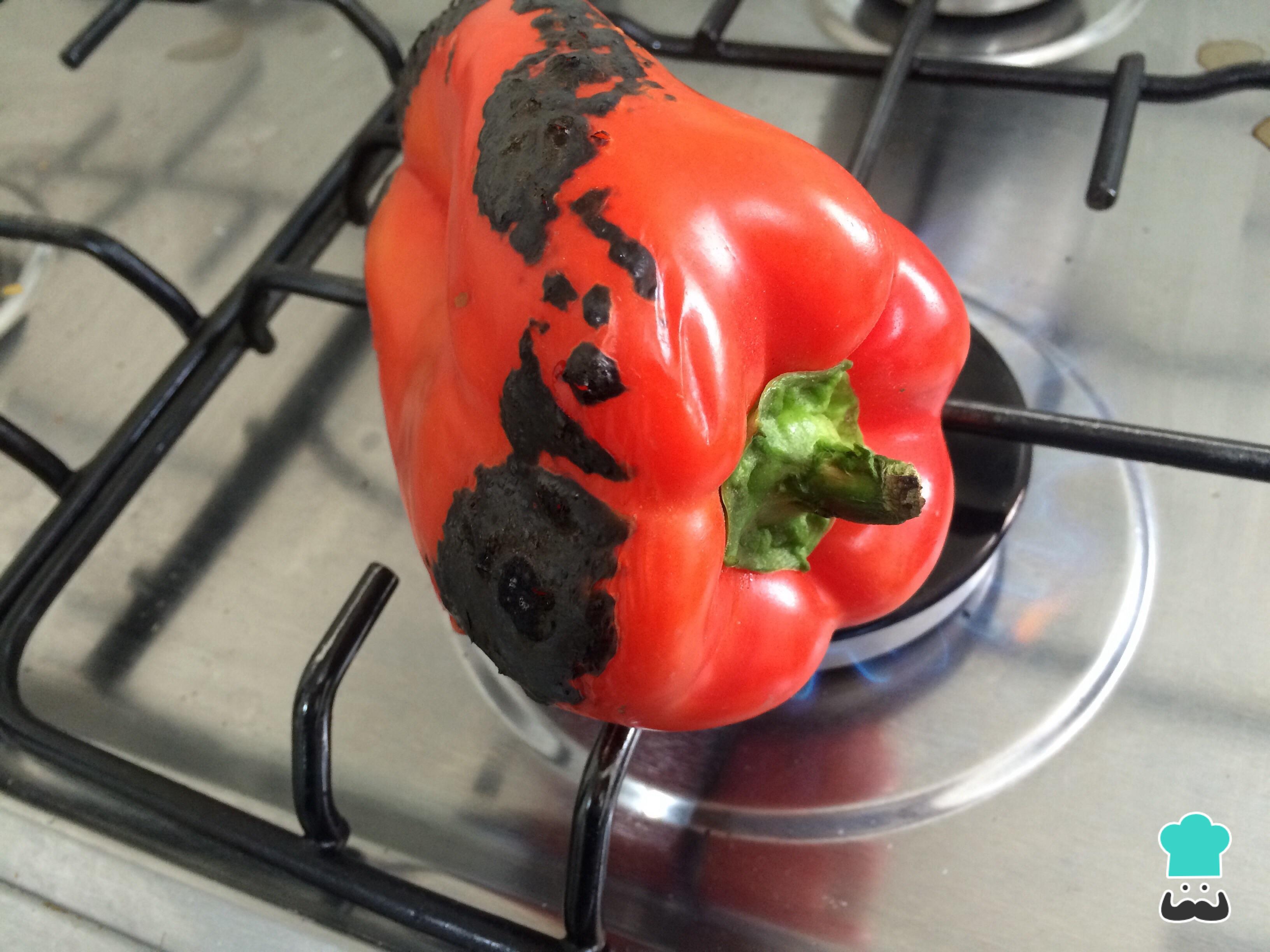 De seguida, para pelar o pimentão facilmente e conferir um gosto defumado a este molho, coloque-o sobre o bico de fogão acesso. Vá virando até ficar completamente preto, depois deixe esfriar para raspar a pele queimada e retirar as sementes no interior.
