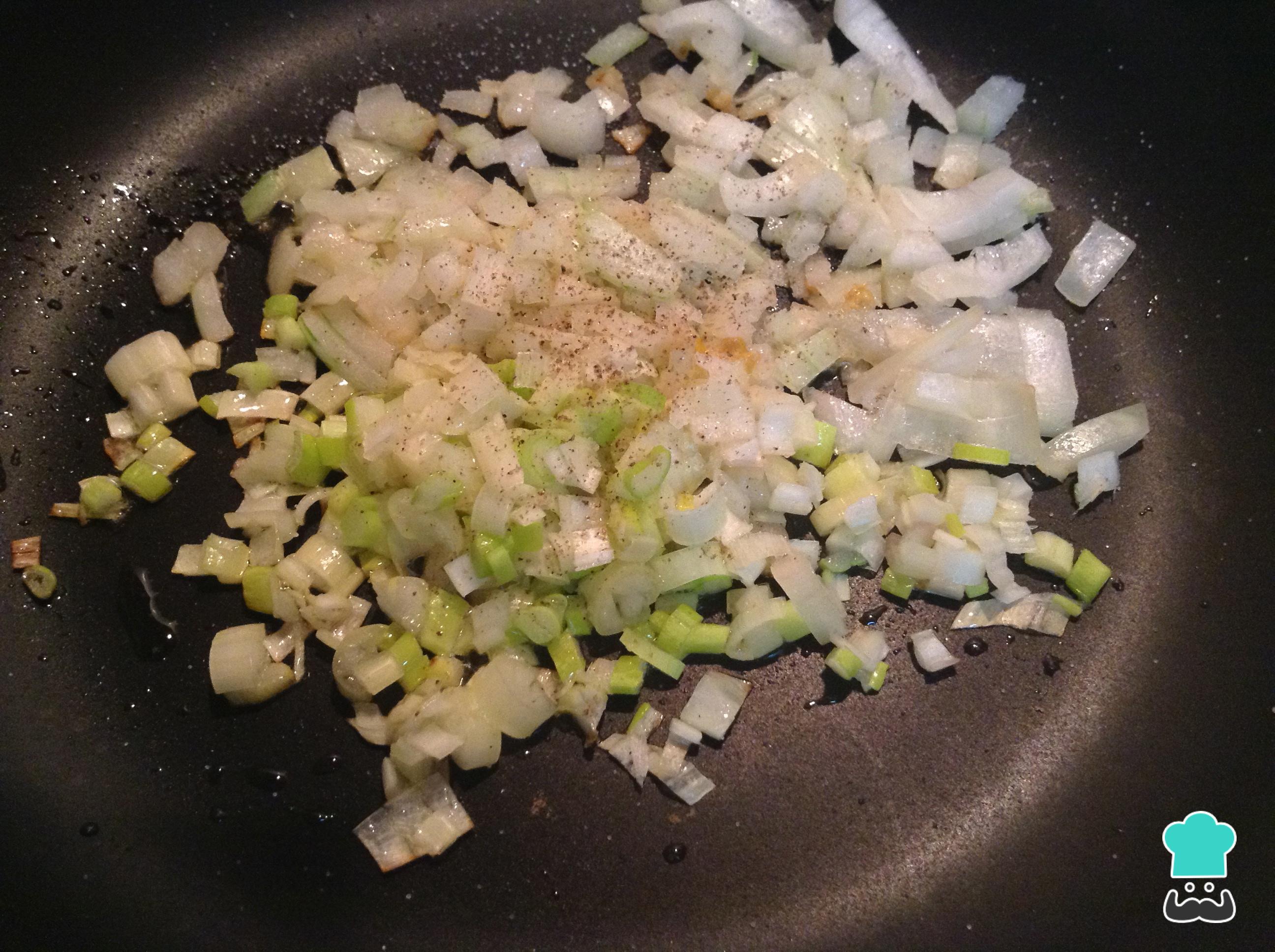 Ponha uma frigideira em fogo médio e adicione uma colher de sopa de óleo de girassol, junte o alho-poró e a cebola também picada finamente.