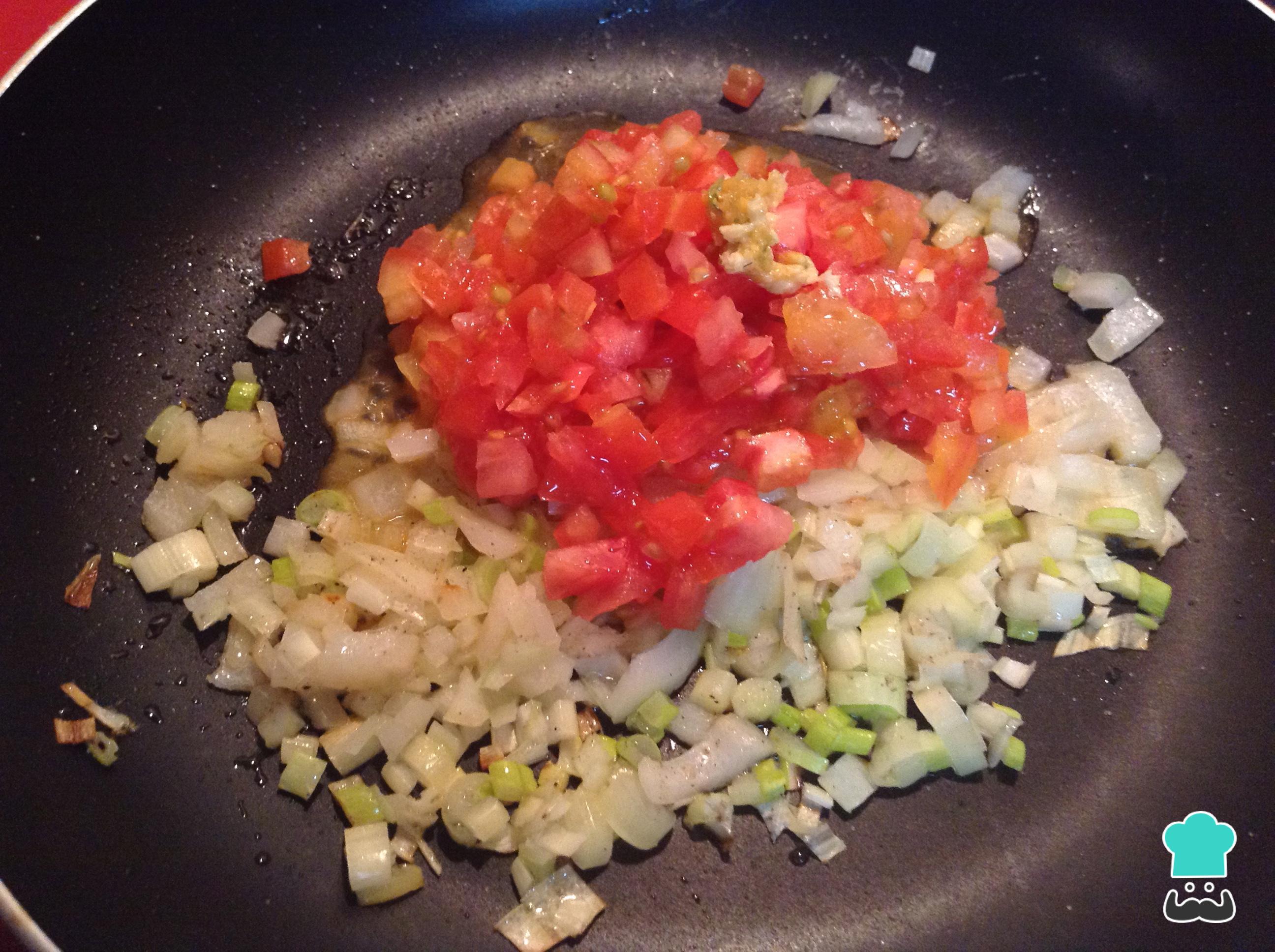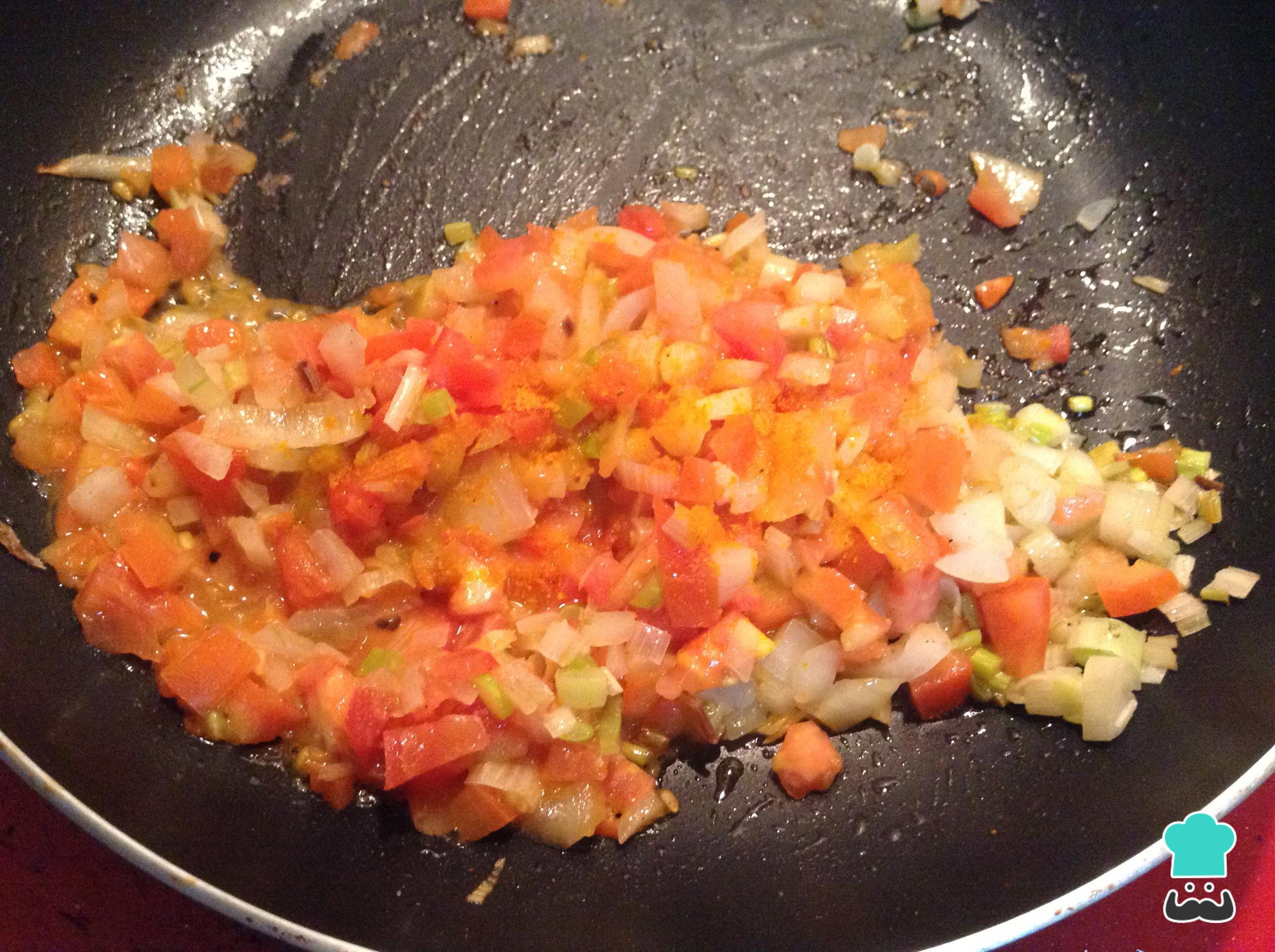Assim que a cebola começar a ficar transparente, junte p tomate cortado em cubinhos pequenos e deixe refogar durante uns minutos. Adicione a pasta de alho e os cominhos a gosto, isto vai dar um toque especial ao nosso molho colombiano.