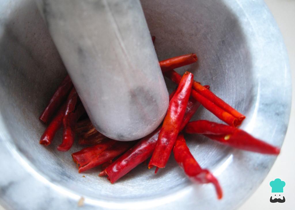 Coloque as pimentas malaguetas e as pimentas de cheiro num pilão e amasse até obter uma pasta. Reserve.