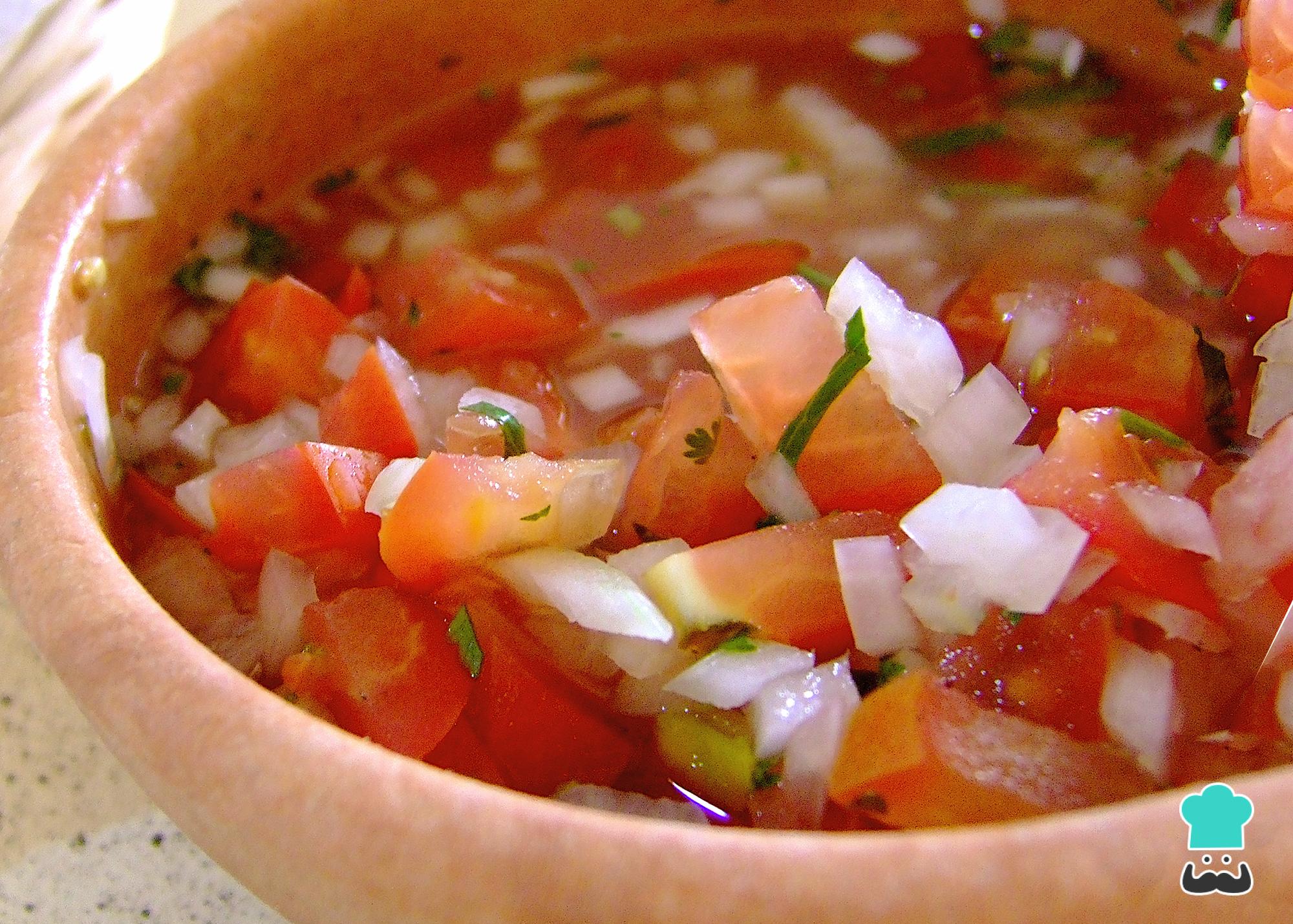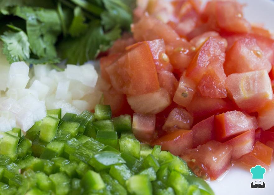 Pique finamente os restantes ingredientes: os tomates (sem sementes), o pimentão (sem sementes nem a parte branca), a cebola e o coentro.
